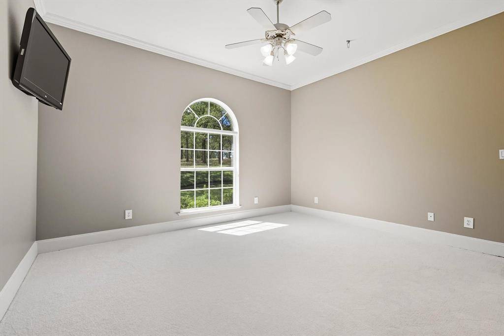 Inside, you'll find elegant crown molding, hardwood floors, and a flowing layout with multiple living and dining areas. The gourmet kitchen features granite counters, double ovens, a gas cooktop, warming drawer, microwave island, and walk-in pantry. The main living room centers around a fireplace with custom built-ins, while the upstairs family room offers a wet bar, private balcony, and pond views. The primary suite on the main level includes a sitting area, fireplace, jetted tub, and walk-in closet. A guest bedroom with private entrance on the main level and an upstairs bedroom with ensuite provides flexibility for family or visitors.