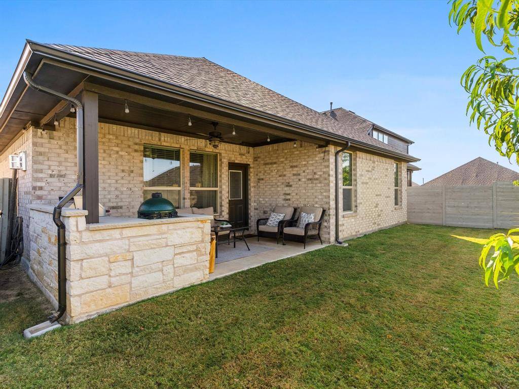 Outdoor living featuring a built-in gas grill and refrigerator, a great space to watch your favorite football team in the Texas fall.