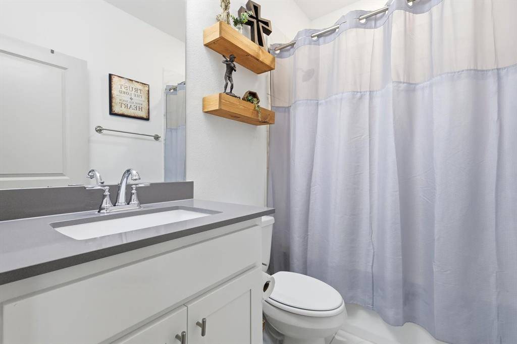The kitchen has been completely transformed, featuring an extended quartz island, marble tile backsplash, custom wood shelving, plantation shutters, and designer lighting—perfectly blending style and everyday functionality. A remodeled powder bath adds a modern, high-end touch. Upstairs, a built-in desk enhances the bonus room's versatility, while the spacious primary suite offers a serene retreat. The walk-in closet is thoughtfully designed with built-in dressers and expanded hanging space for exceptional organization.