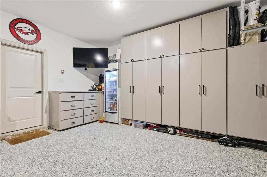 The garage is equally impressive, boasting extensive custom cabinetry for abundant storage and a sleek epoxy-coated floor for durability and a polished look.