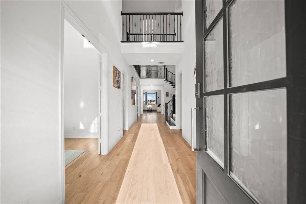 Exquisite 4,875-square-foot home showcasing transitional luxury. This 2022 American Legend residence at 2037 Waterleaf is gracefully positioned on a premium corner lot overlooking a tranquil pond, set on .41 acres. Upon entry, the home is filled with natural light, highlighted by beautiful white oak flooring throughout the main level; immediately establishing a sense of timeless sophistication. Offering 5 bedrooms, 5.5 baths, and a 3-car garage, this exceptional home is thoughtfully designed to blend refined elegance with effortless livability. Soaring vaulted ceilings and a dramatic cascade of windows create a bright and airy ambiance across the expansive open floor plan. The chef's kitchen servesas the heart of the home; seamlessly connecting the living and dining areas. Designed for both everyday living and entertaining, it features KitchenAid appliances, an adjacent dining space, a butler's pantry, designer lighting, and luxurious finishes throughout. The primary suite serves as a private retreat, complete with a spa-inspired bath featuring a separate soaking tub, oversized walk-in shower, and expansive his and her closets. Each secondary bedroom offers a private bath, enhancing comfort and functionality. Flexible living spaces abound; including a media room, game room, and additional bonus living area. Meticulously curated details extend from the oversized utility room to the high-end finishes throughout. With serene pond views, abundant natural light, and impeccable craftsmanship, this residence embodies elevated living in one of Haslet's most desirable settings. Welcome home!