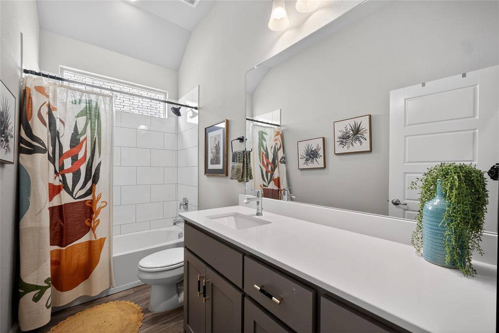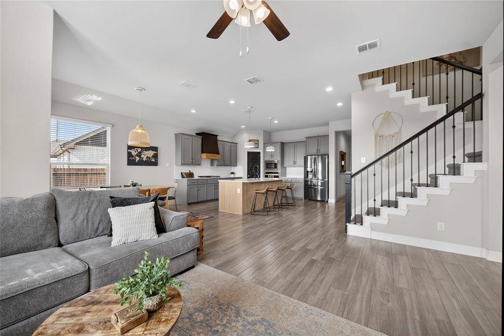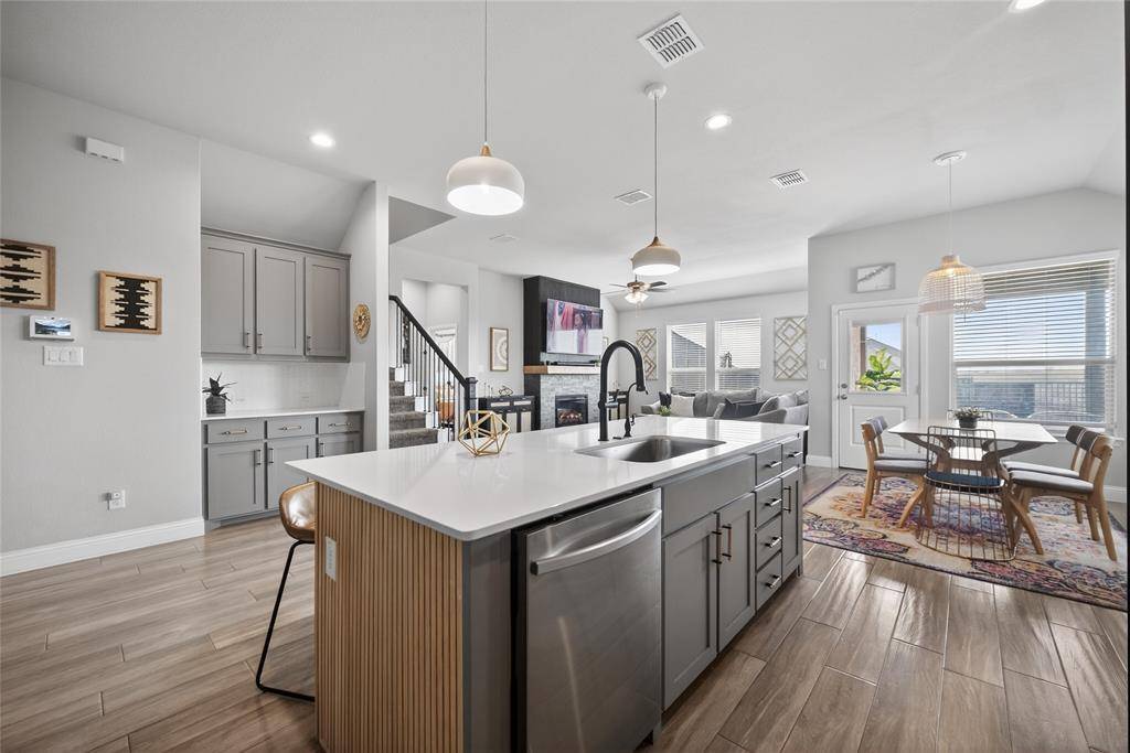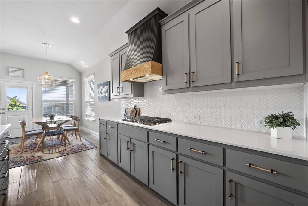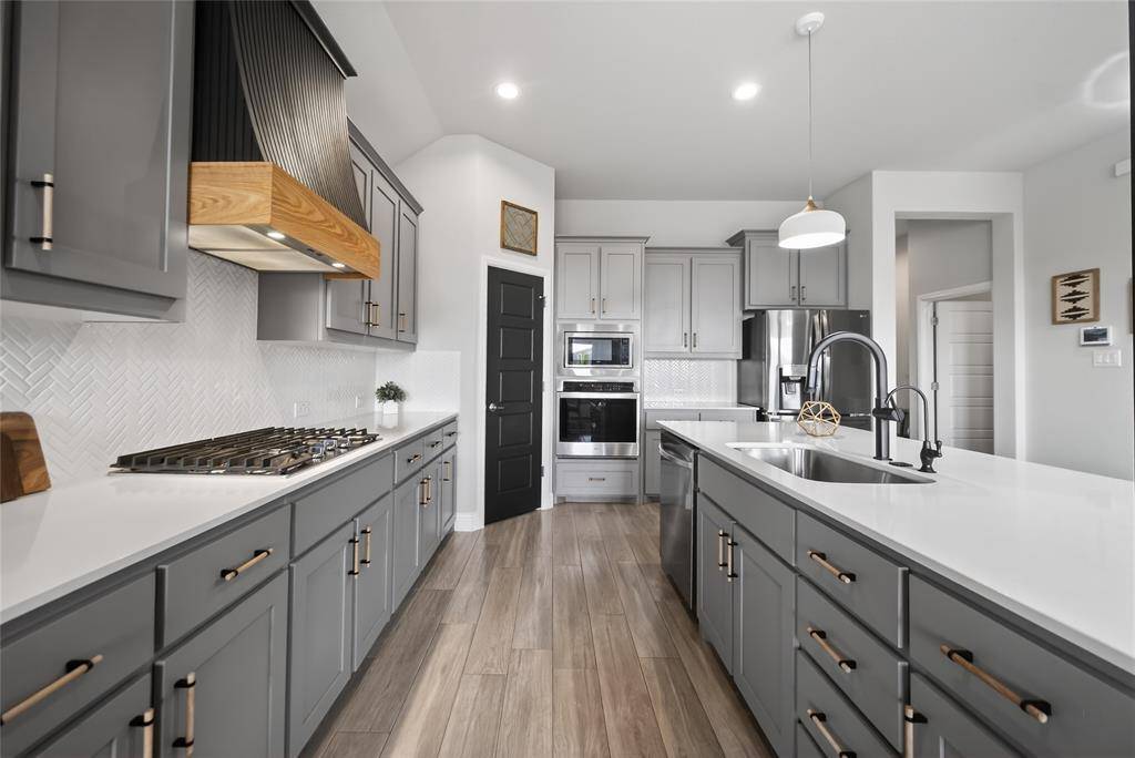 Inside, the open-concept living spaces are anchored by a designer kitchen featuring custom upgrades, including a wood-wrapped kitchen island with coordinating custom hood, upgraded kitchen hardware & faucet, and enhanced lighting selections that elevate the entire space. These details create a cohesive aesthetic ideal for both entertaining and daily living.