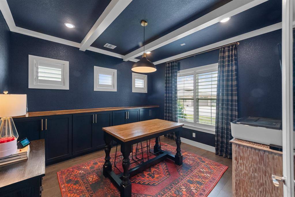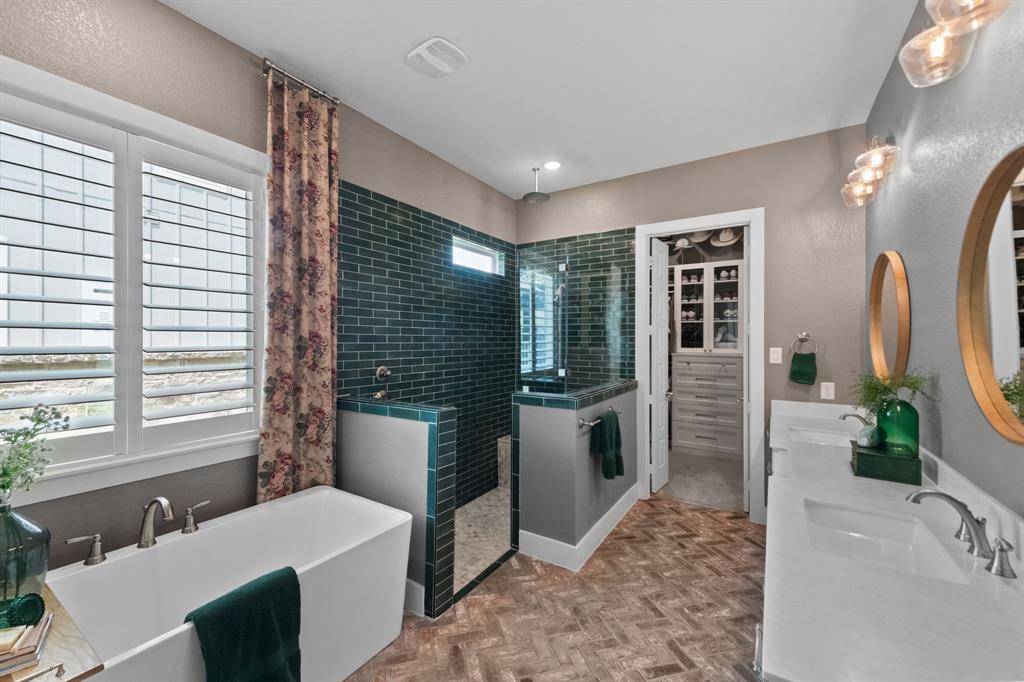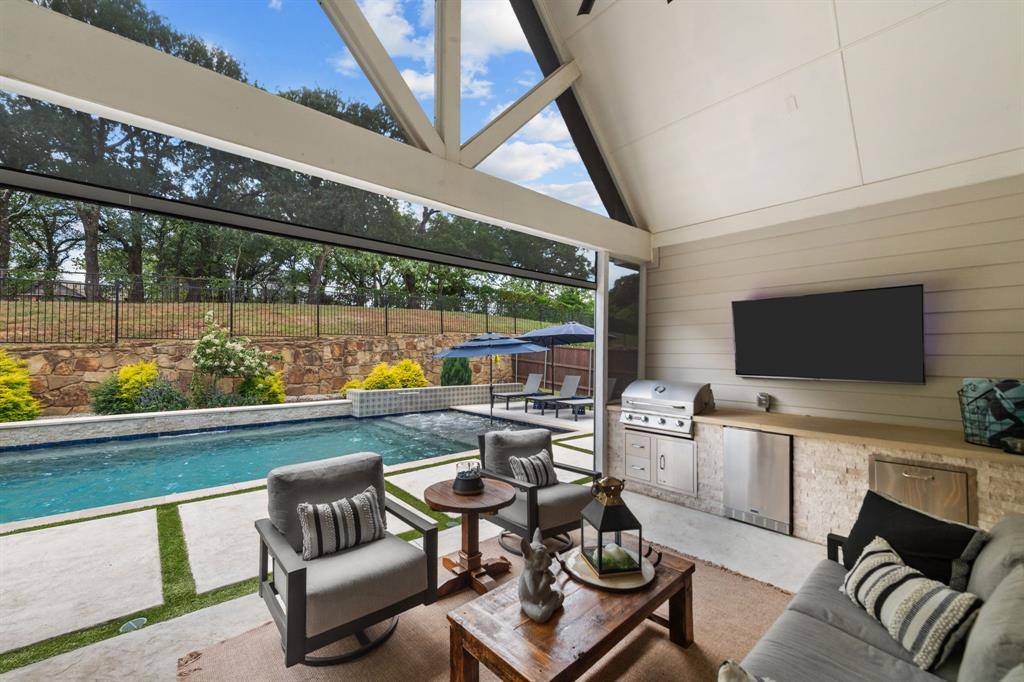 Welcome home to this well-appointed estate in sought-after 5T Ranch, where no detail has been overlooked. Upon stepping in, one quickly realizes there are custom touches throughout the home, from the upgraded kitchen to the resort-style backyard oasis. Moving through the main floor is effortless because of the functional floor plan that flows from the grand two-story foyer to the main living, kitchen, and dining room. Once in the kitchen, the homeowner will enjoy Cafe appliances, an oversized counter-height island, large walk-in pantry, and decorative luxury lighting. From the kitchen, one can enjoy views of the dining room and main living area, with vaulted ceilings, a focal-point fireplace, and a wall of windows overlooking the outdoor living spaces. The primary suite is an escape with board-and-batten wall, views of the backyard, spa-like bath with rainfall shower, soaking tub, and custom closet. Other main floor highlights are a sophisticated study with built-in cabinets and a private guest suite with a walk-in closet. Continuing upstairs, a split staircase will take you to your secluded game room away from the hustle of the rest of the home, and on the other side, you will find two bedrooms with a Jack and Jill bath and walk-in closets. Outside, the designer touches continue with a covered patio featuring an outdoor kitchen with a built-in grill and fridge, which will please any grill master, as well as automatic screens and a large fan to cool off during those warm Texas summers. The backyard pool is the center of the fun, with a hot tub, tanning ledge, waterslide, and water feature all overlooking the community walking trail with large trees. This property has so many designer upgrades, it is a must see!