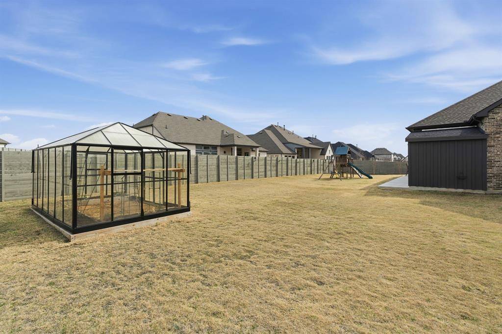 Step outside to your backyard retreat featuring a stunning custom stone outdoor fireplace and built-in outdoor kitchen — ideal for hosting, relaxing on cool Texas evenings, or enjoying game day outdoors. The exterior also includes a custom storage shed attached to the home for added convenience and a greenhouse.