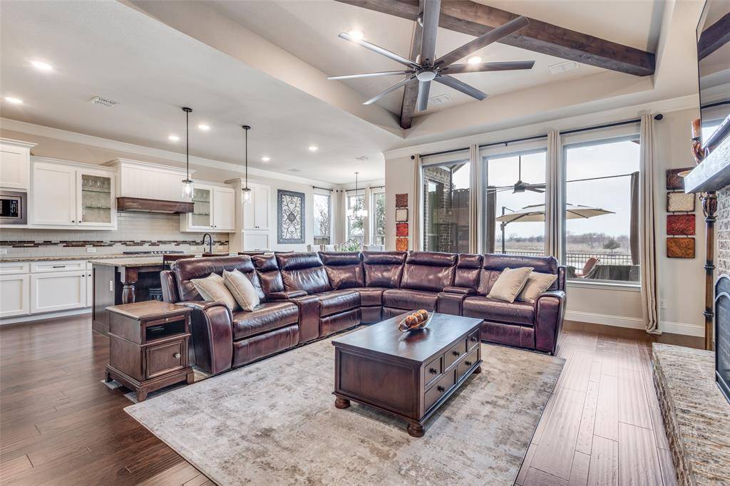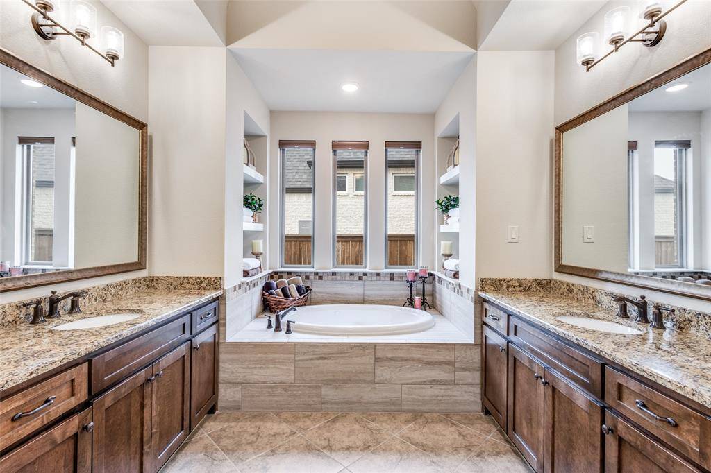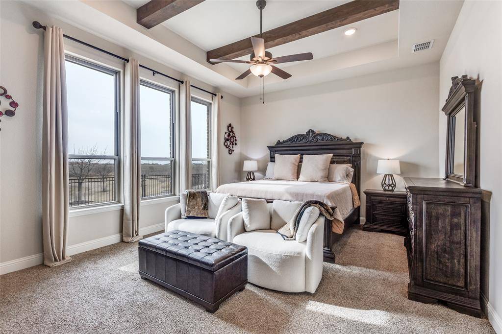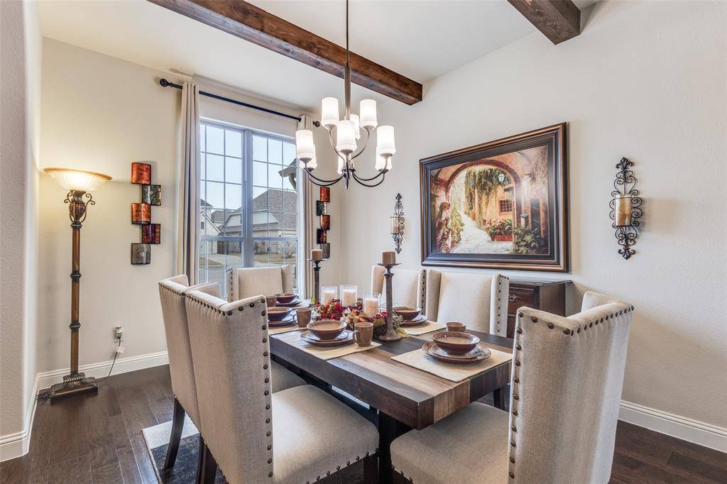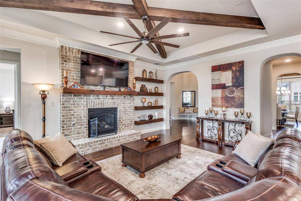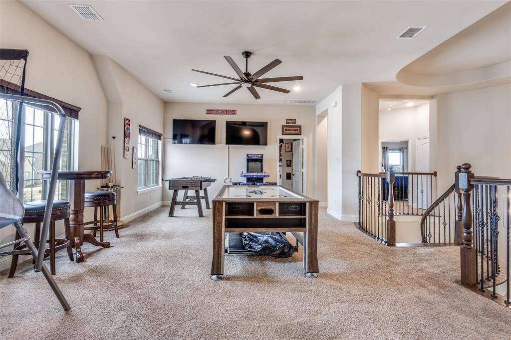 This immaculate family home is loaded with upgrades & has fantastic views of the community walking trail and pond! This beautifully designed residence features an open layout filled with natural light. As you enter you'll be impressed with the rotunda type foyer with a sweeping staircase with wood treads. The thoughtful floor plan offers two bedrooms on the first floor, ideal for guests or multigenerational living, along with spacious game and media rooms upstairs for additional entertaining and relaxation. The heart of the home showcases seamless flow between the living, kitchen, and dining areas, making daily living as well as hosting family & friends enjoyable. Retreat to the enclosed covered patio with a fireplace & additional patio area where you can sit after a long day and take in the amazing view. Need storage? This home is LOADED! Very large closets and a fully decked large attic! Light Farms offers resort-style amenities, including pools, fitness centers, pickleball and tennis courts, miles of trails & vibrant community events throughout the year! Located just a stone's throw from the new DNT expansion that leads to the new H-E-B, PGA Headquarters & the upcoming Universal Studios! Sought after Prosper ISD! VA Assumable Loan at 4.25%!