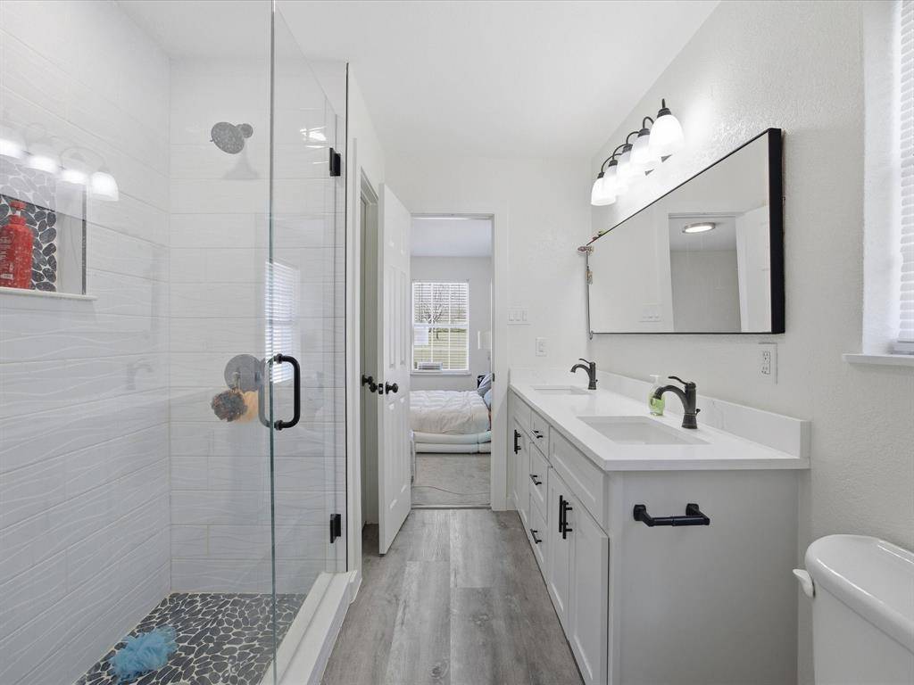 The kitchen is designed for function with ample cabinetry, stainless steel appliances, generous prep space, and a large center island for gathering. The primary suite offers a relaxing retreat, complemented by an updated bath featuring dual sinks and a sleek, glass-enclosed shower. Flexible secondary spaces can serve as bedrooms, a home office, hobby room, or workout area, and the oversized garage provides extra room for storage, projects, or weekend hangouts.