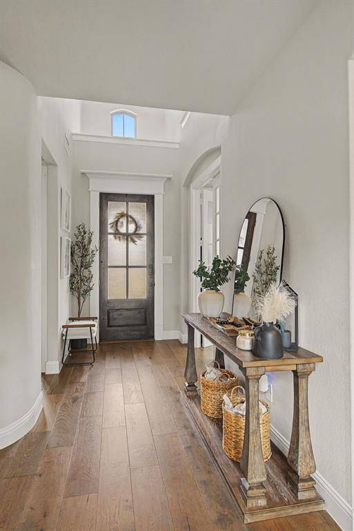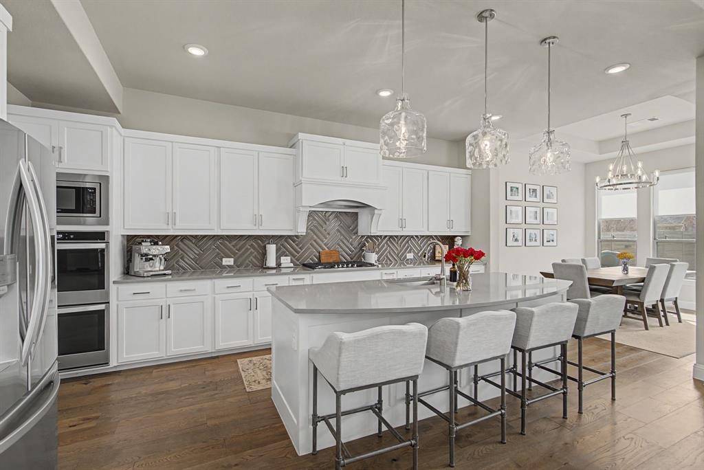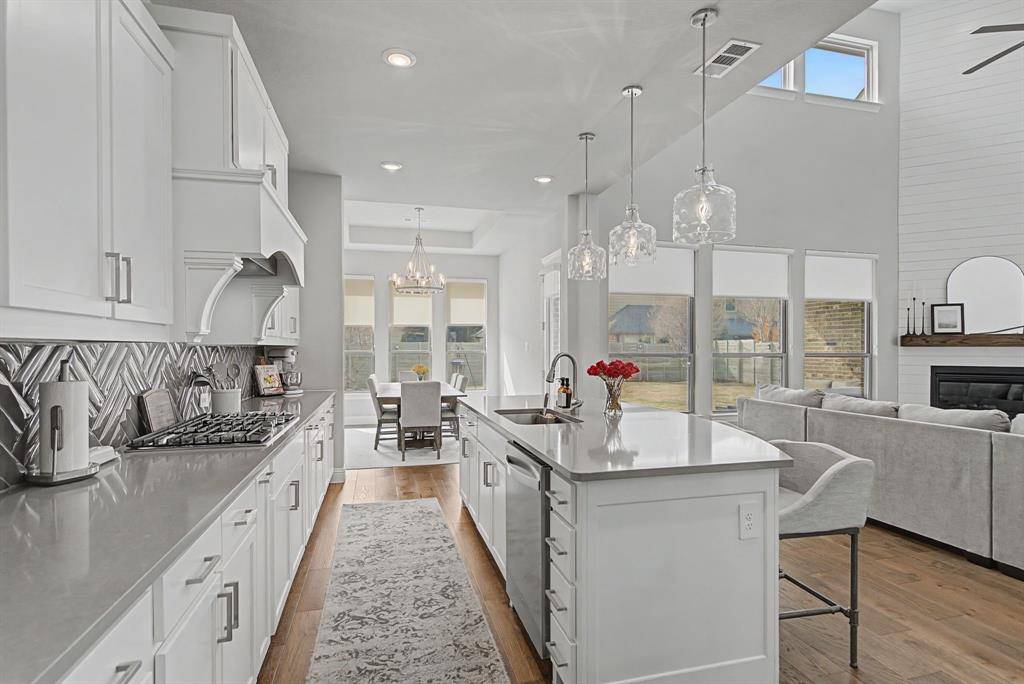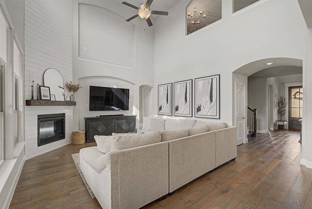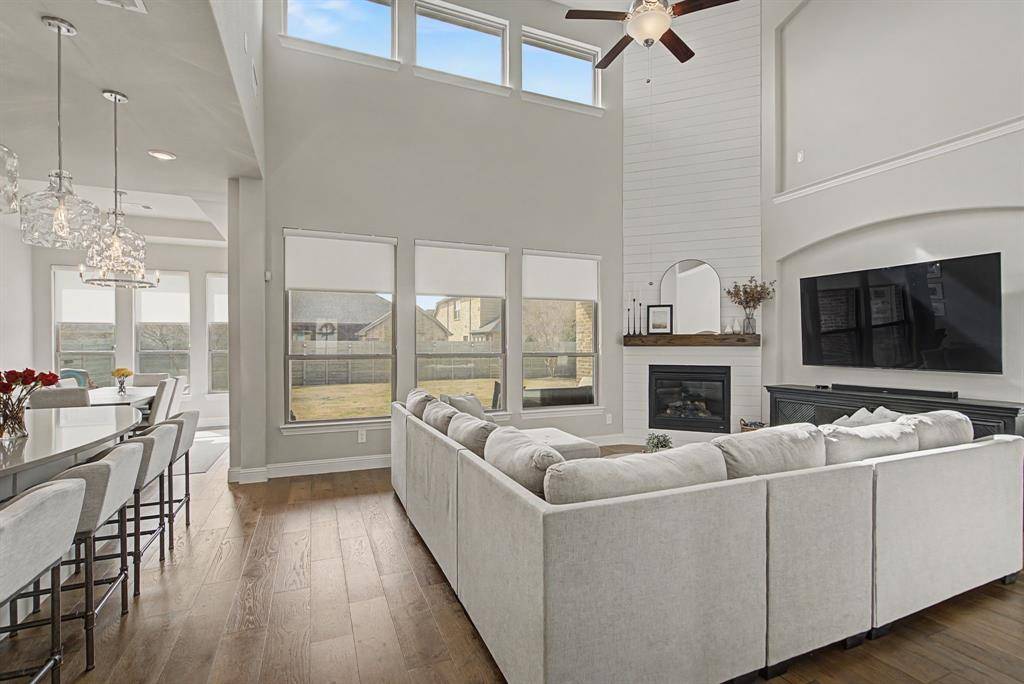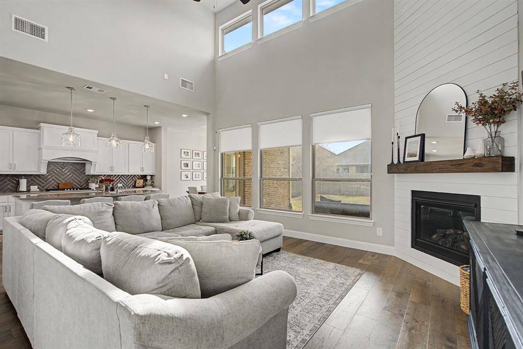 Welcome to luxury living in the award-winning Harvest community. This stunning 5-bedroom, 3-bathroom residence, built by Coventry Homes, perfectly blends modern sophistication with everyday functionality on an oversized 0.33-acre lot. From the moment you step through the grand foyer, you are greeted by soaring two-story ceilings and a wall of windows that floods the home with natural light. The heart of the home is a chef-inspired gourmet kitchen featuring a massive central island with seating, premium gas cooktop, built-in stainless appliances, and a spacious walk-in pantry. The open-concept design flows seamlessly into the expansive living area, anchored by a sleek fireplace—perfect for entertaining.
