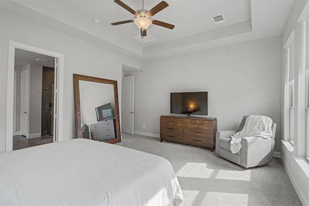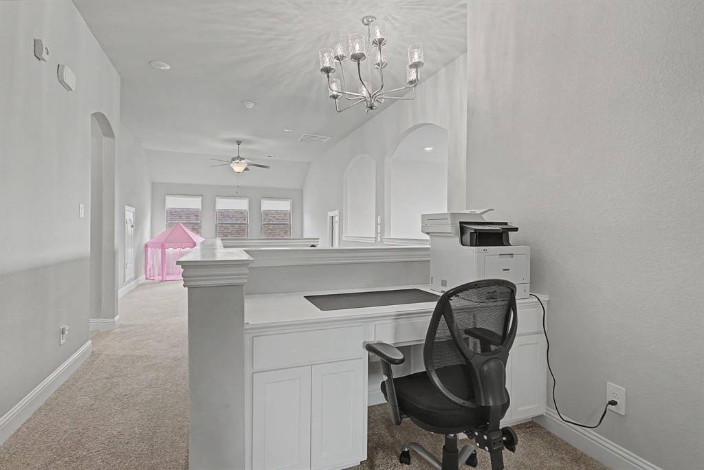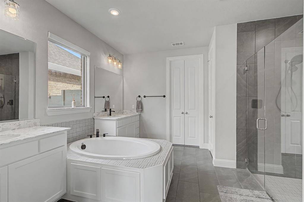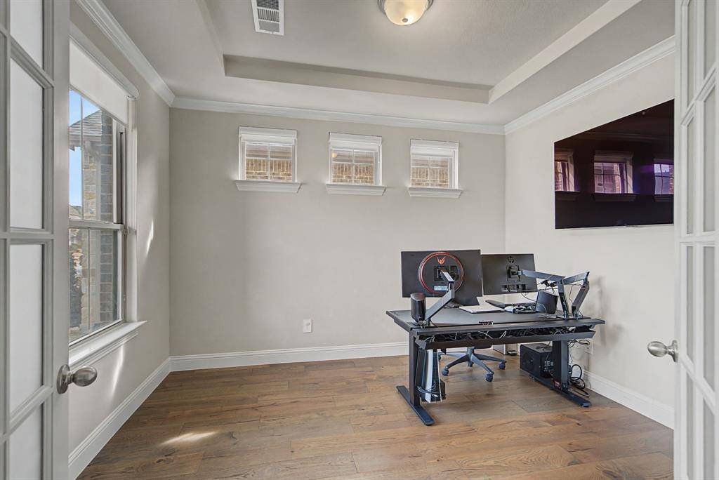 The primary retreat, located on the main floor, offers a spa-like escape with tray ceilings and an ensuite bath featuring dual vanities, a deep garden tub, a separate walk-in shower with seating, and a massive walk-in closet. Upstairs, discover a versatile game room with a built-in workspace, ideal for a home office or student study hub, alongside well-appointed secondary bedrooms. Step outside to a covered patio overlooking a large, flat backyard—a blank canvas ready for a pool or outdoor kitchen. Situated on a premium 70-foot wide lot, this home offers rare privacy and curb appeal. Residents of Harvest enjoy world-class amenities including resort-style pools, a fitness center, organic community gardens, a coffee house, and miles of scenic trails.This is more than a house; it's a lifestyle.
