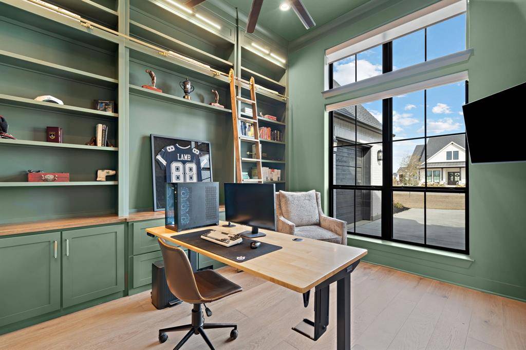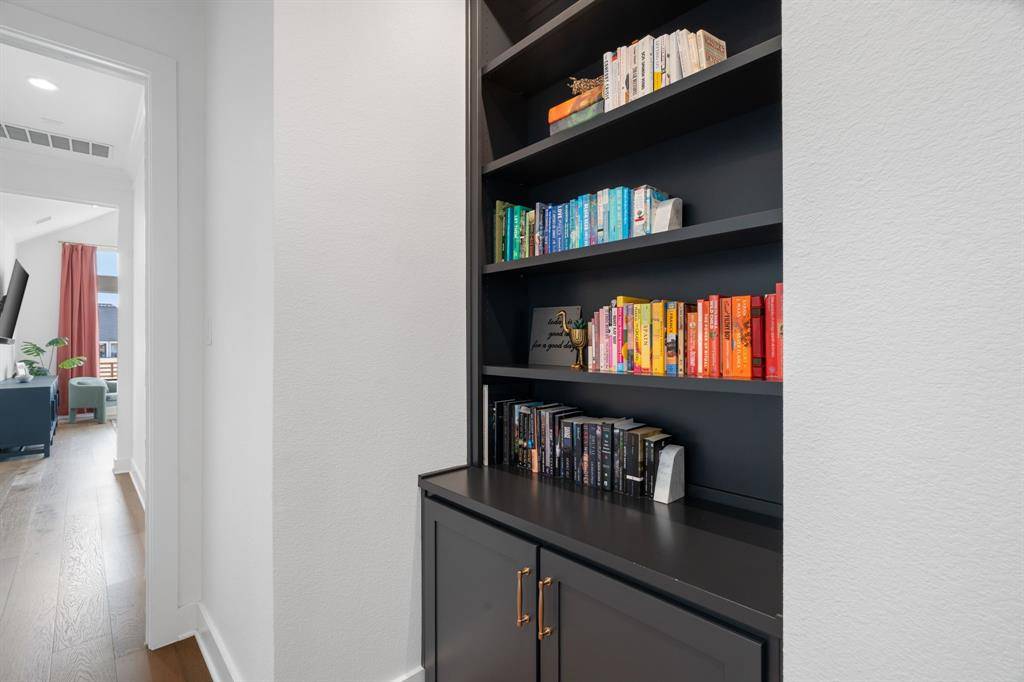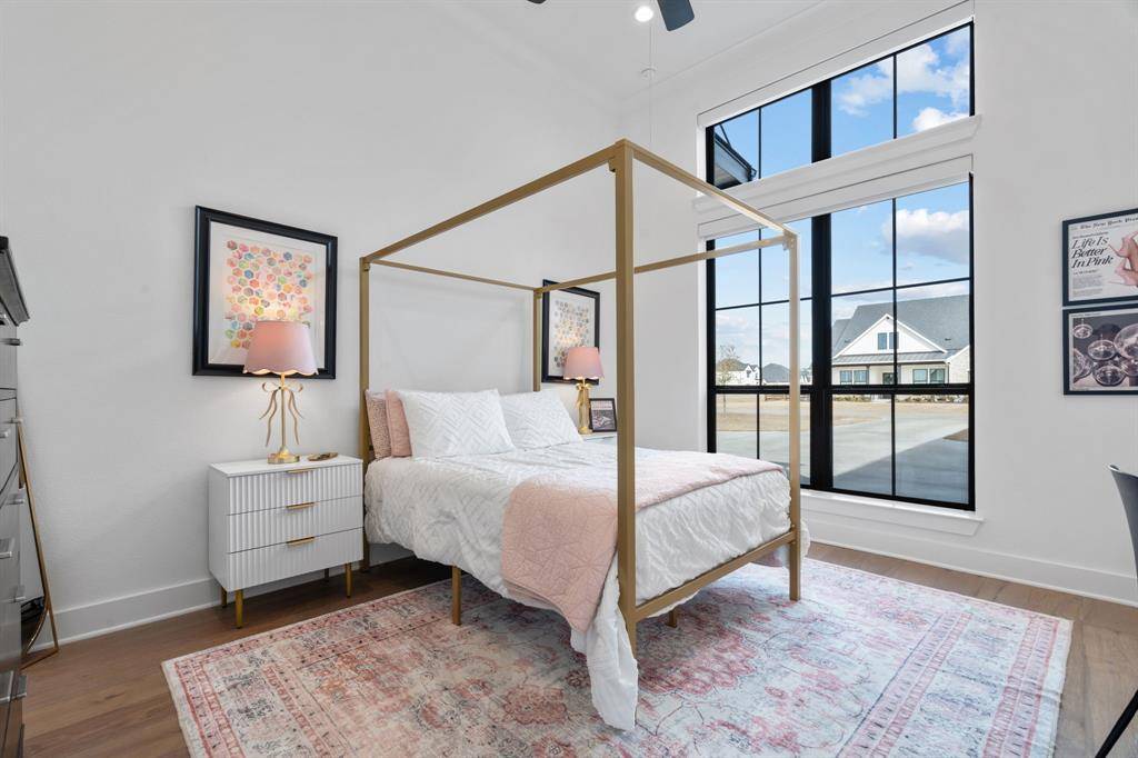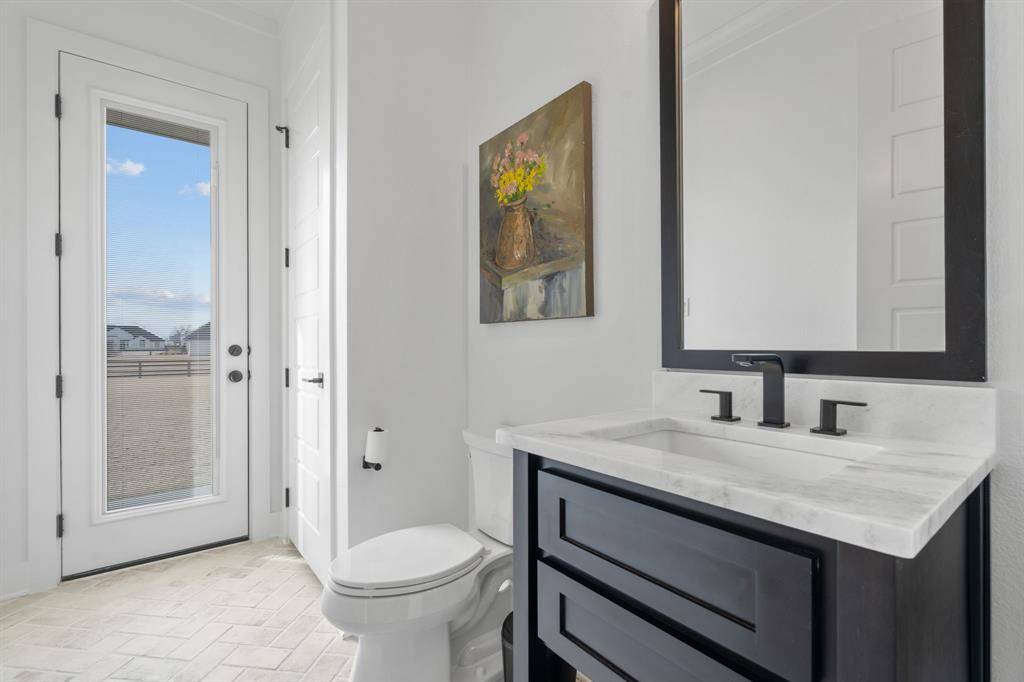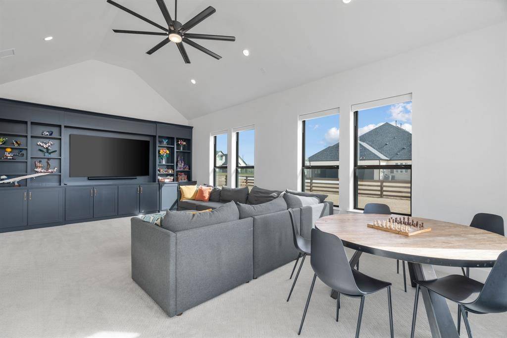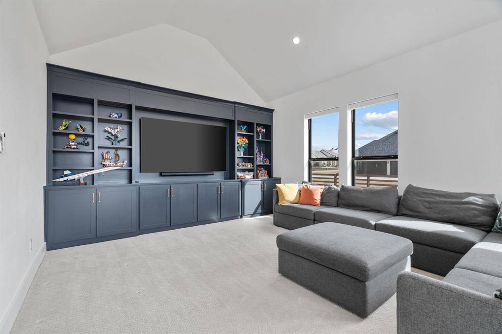The expansive primary suite offers dual custom-finished walk-in closets and a spa-inspired bath complete with dual vanities, a soaking tub, luxe shower with three shower heads, linen storage, and a private water closet. Each secondary bedroom includes its own en-suite bath and walk-in closet. A spacious flex room serves perfectly as a game or media space, anchored by a built-in entertainment wall with exceptional storage. A powder bath with direct outdoor access provides the ideal setup for a future pool bath.