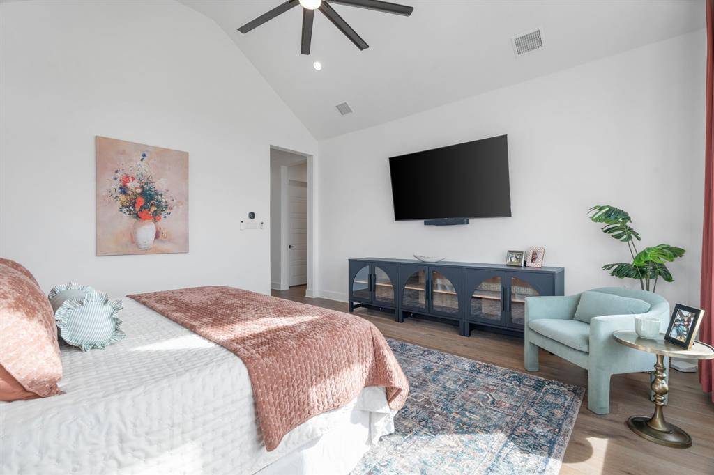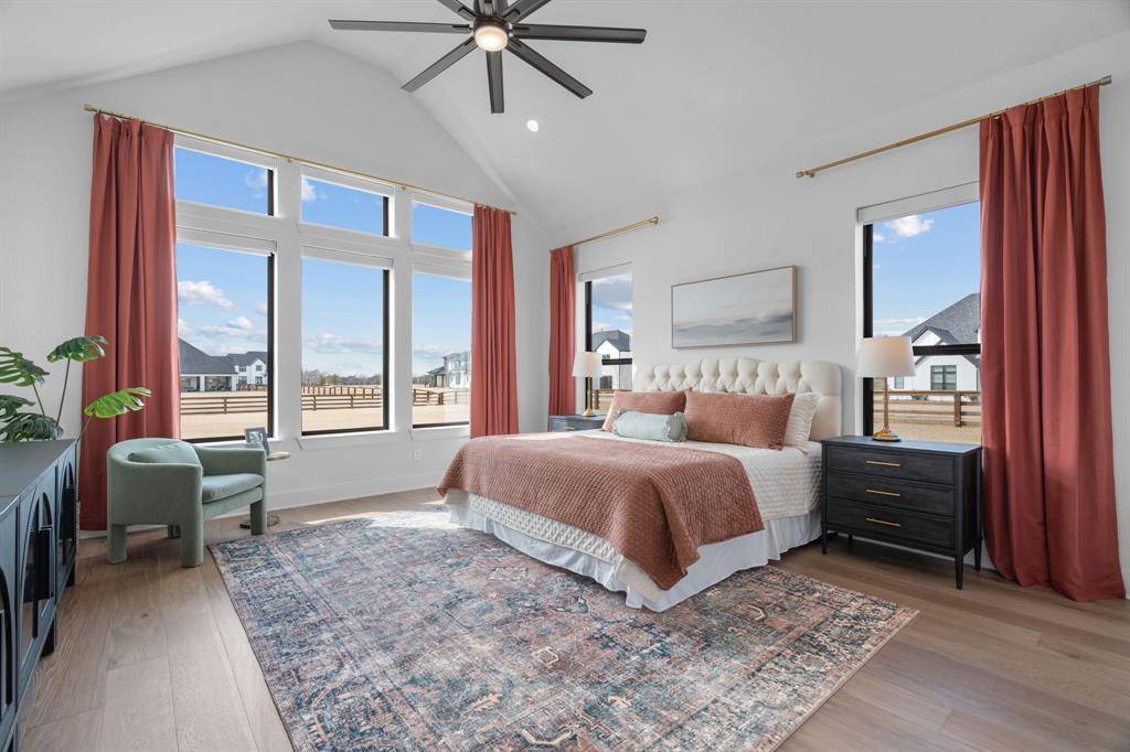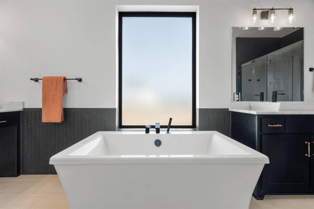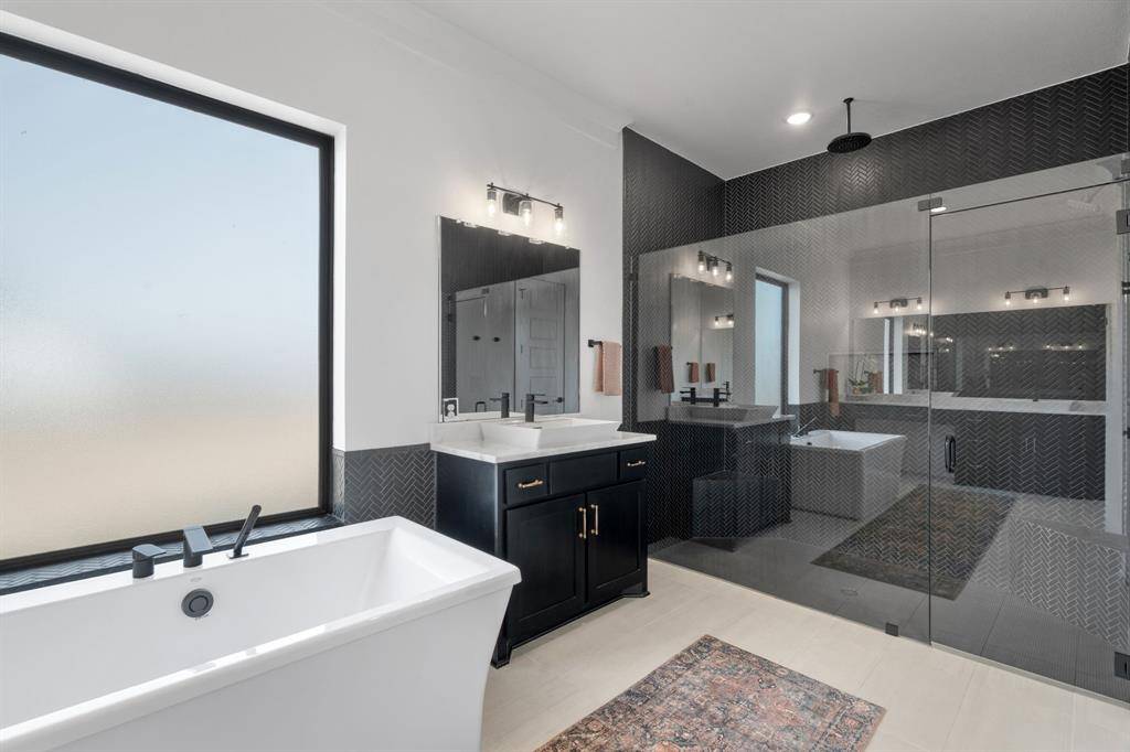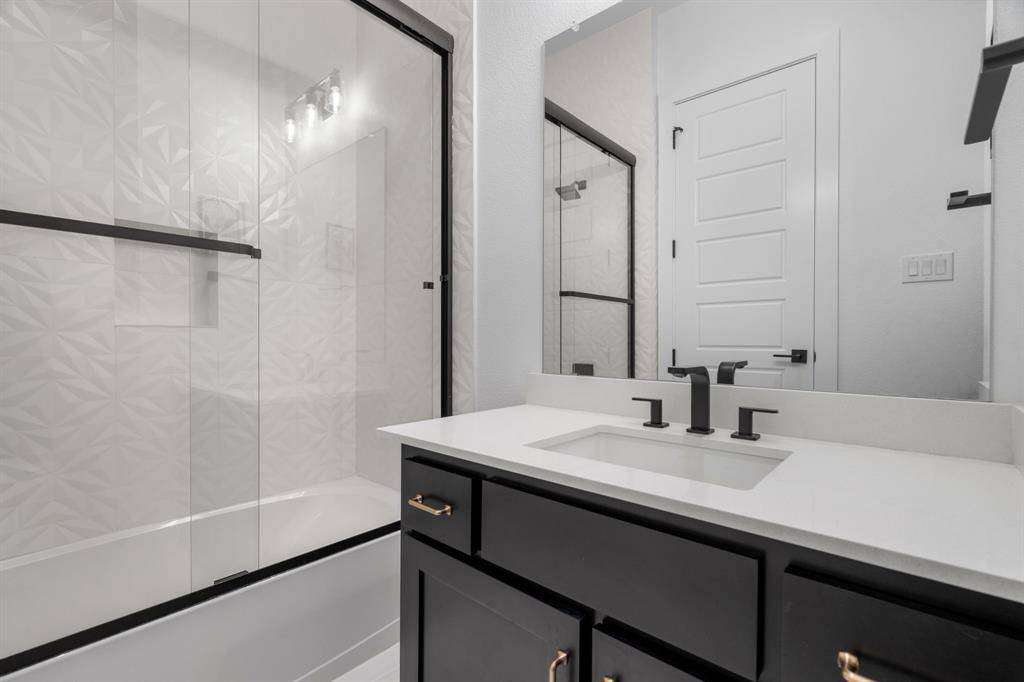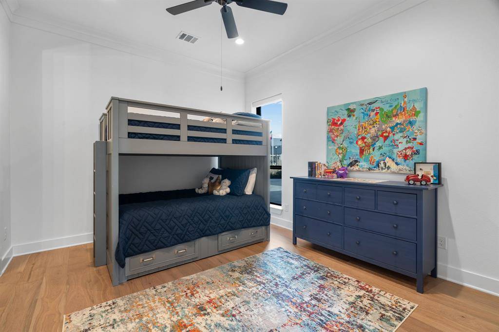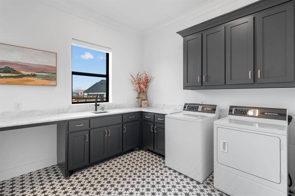 The expansive primary suite offers dual custom-finished walk-in closets and a spa-inspired bath complete with dual vanities, a soaking tub, luxe shower with three shower heads, linen storage, and a private water closet. Each secondary bedroom includes its own en-suite bath and walk-in closet. A spacious flex room serves perfectly as a game or media space, anchored by a built-in entertainment wall with exceptional storage. A powder bath with direct outdoor access provides the ideal setup for a future pool bath.