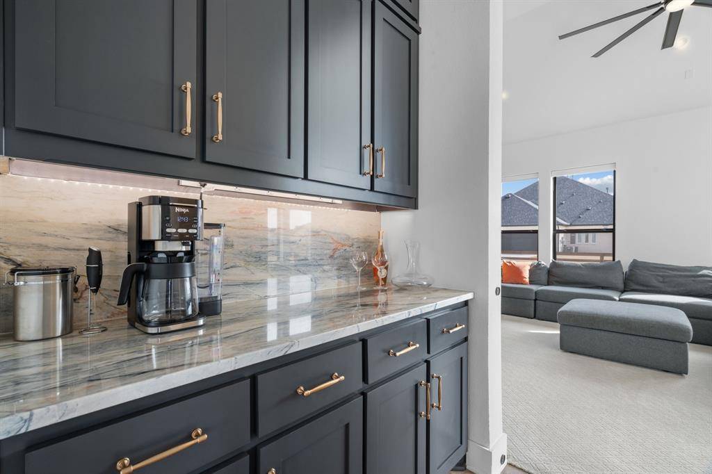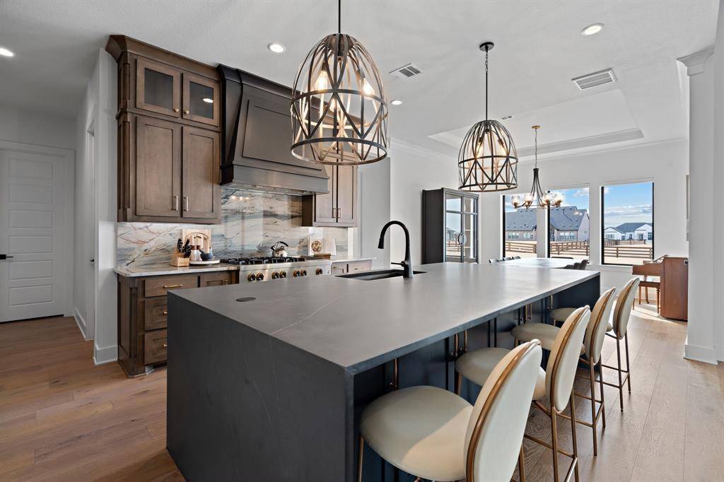 The kitchen is a true showpiece, highlighted by an oversized waterfall honed quartz island with breakfast bar, striking quartzite countersplash, Sub-Zero refrigerator, abundant cabinetry, under- and upper-cabinet lighting, and a generous walk-in pantry.