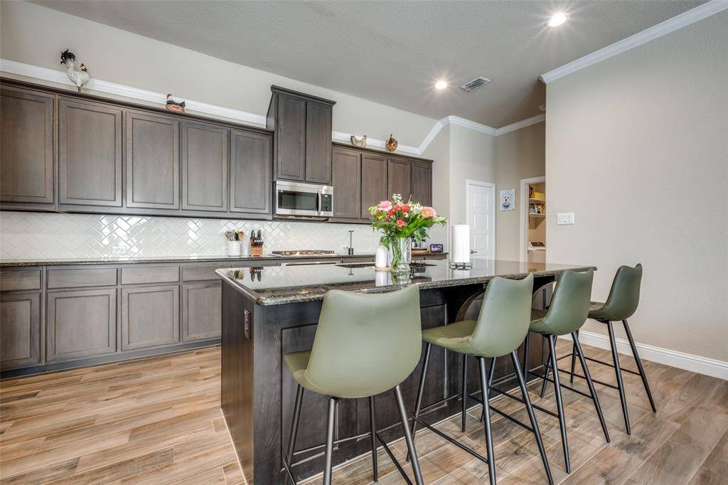 Open-concept floor plan with wood-look flooring, neutral tones, and abundant natural light. Spacious living area flows into the kitchen featuring granite countertops, stainless steel appliances, dark cabinetry, and a large island. Private primary suite with dual sinks, oversized walk-in shower, and walk-in closet.