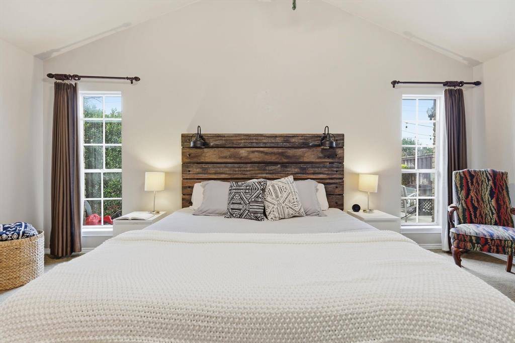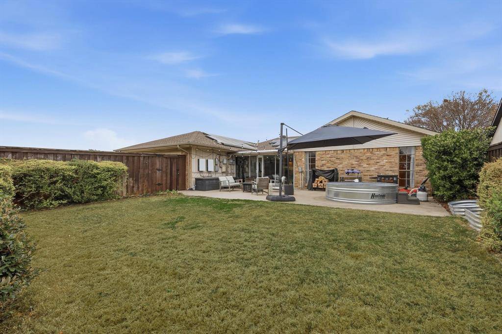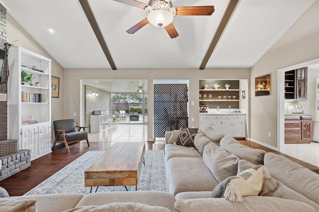 This charming single-story home offers a spacious and functional layout with 3 bedrooms and 2 baths, designed for both comfort and everyday living. Hardwood floors flow throughout the main living areas, creating a warm and inviting feel the moment you step inside. The living room features vaulted ceilings with beautiful exposed beams and a cozy gas brick fireplace, making it the perfect gathering space. Just off the main living area, a versatile bonus room with sliding glass doors that overlook the backyard and can easily serve as a home office, playroom, or second living space. The open and spacious kitchen is ideal for both daily living and entertaining, featuring stainless steel Bosch appliances and a window over the sink that fills the space with natural light. A charming bay window in the breakfast area creates a bright and inviting spot to start your day. A convenient wet bar in the living room adds an extra touch for hosting guests. All bedrooms are generously sized, offering plenty of space. The oversized utility room provides excellent functionality with additional storage. Step outside to a large backyard with a patio—perfect for outdoor dining, relaxing evenings, or weekend gatherings. Recent upgrades include a solar panel system, a full electrical panel replacement, EV charging outlet, and a smart thermostat, offering modern efficiency and convenience. Ideally located with close proximity to Harold K. Bessire Park.