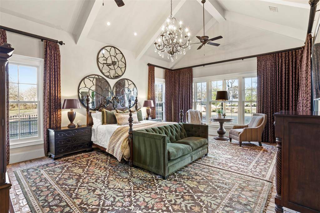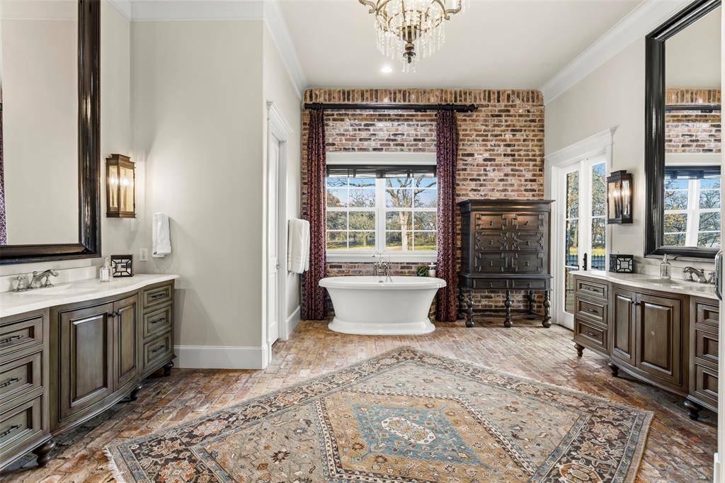 Inspired by the romance and timeless character of the French Quarter, this extraordinary, gated estate on nearly 6 acres offers over 13,000 square feet of living space, blending historic architectural elements with modern luxury. Chicago antique brick spans both the exterior and interior, complemented by antique paver flooring, reclaimed wood floors, and curated antique doors sourced from Paris flea market finds. Statement chandeliers from a historic New Orleans Catholic girls school add a layer of authenticity and charm, while extensive attention to detail is evident throughout. Designed for elevated living and effortless entertaining, the home features Wolf and Sub-Zero appliances, Control4 home automation, and high-end finishes. French Quarter-style balconies and covered patios overlook the resort-inspired pool and spa, creating a private retreat surrounded by lush grounds. Functionality meets efficiency with an attached 6-car garage, air-conditioned storage rooms, and geothermal heating and air. The Party Barn enhances the estate lifestyle and is comprised of three functional areas: a 1,177 sq ft entertainment party room ideal for hosting, a 1,434 sq ft upstairs guest home with 896 sq ft finished including a kitchen and living space, and a 1,863 sq ft workshop-garage offering exceptional flexibility. A rare offering combining European character, New Orleans soul, and Texas scale, this Bartonville estate delivers unparalleled privacy, craftsmanship, and lifestyle.
