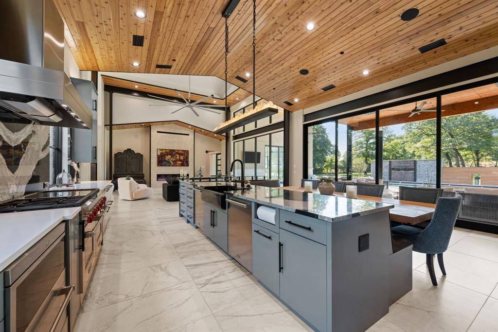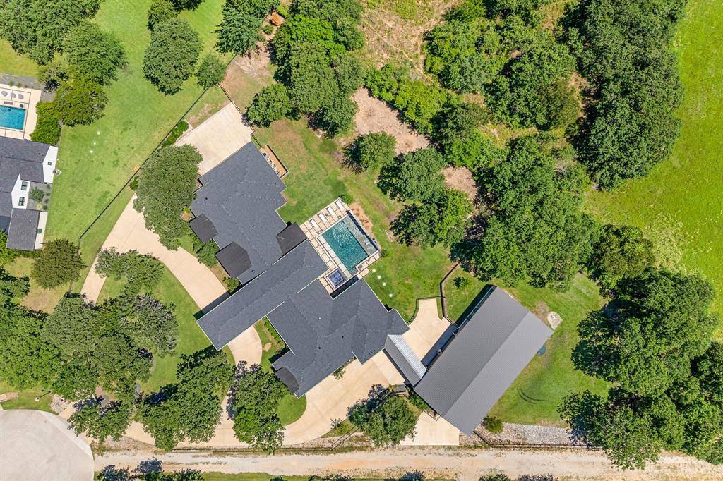 Priced to encourage strong interest. Experience modern luxury on 2 private acres in the prestigious Hat Creek Estates of Bartonville, Texas. This single story architectural masterpiece blends sleek contemporary design w warm natural elements, offering an inviting yet sophisticated retreat behind a gated entrance and circle driveway that leads to a grand entryway. Inside, dramatic ceilings, cedar-paneled accents, and expansive walls of glass create a seamless connection between indoor and outdoor living. The open-concept layout showcases a stone fireplace in the living room and a chef-inspired kitchen featuring a dramatic natural stone island, built-in wine cooler, dual dishwashers, hidden butler's pantry, Sub-Zero refrigerators, Wolf gas range, and wet bar. Accordion glass doors open to the backyard oasis, where resort-style amenities include a sparkling pool, cascading water features, and multiple lounge and dining areas for gatherings. A game room opens directly to the patio area, while the nearby media room offers an ideal space for movie nights or game-day viewing. The luxurious primary suite is a private sanctuary with his-and-her walk-in closets, a spa-like bathroom featuring dual shower heads, separate vanities and an exercise room off the primary bath, with the laundry room conveniently connected to the walk-in closet. Car enthusiasts and adventurers alike will appreciate the impressive 8-car garage w a Tesla charging station and dedicated RV-boat parking. The detached 1,755-square-foot guest house—located off the RV garage—includes 2 bedrooms, 2 bathrooms, walk-in closets, its own living and dining area, and a full kitchen, perfect for extended family or guests. Every detail of this home exudes sophistication and comfort, from designer finishes throughout to its thoughtful layout designed for seamless living and entertaining. With its refined craftsmanship, privacy, & resort-style amenities, this estate represents the pinnacle of Bartonville luxury living.