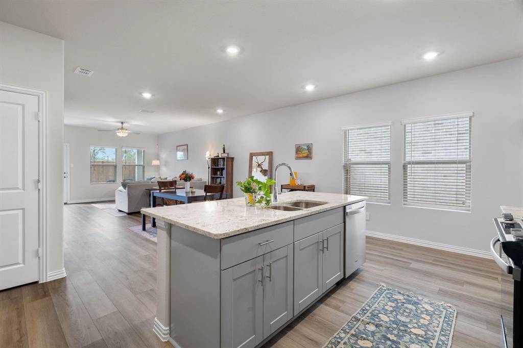 The kitchen features sleek cabinetry, stainless steel appliances, and plenty of counter space that flows seamlessly into the main living area — perfect for everyday life or entertaining.