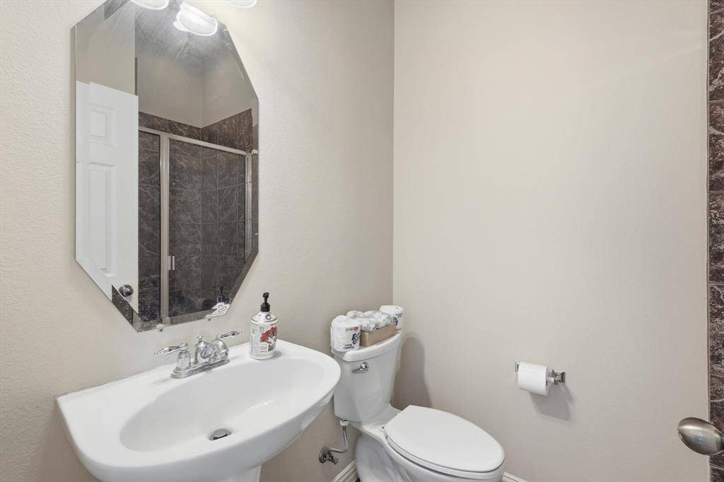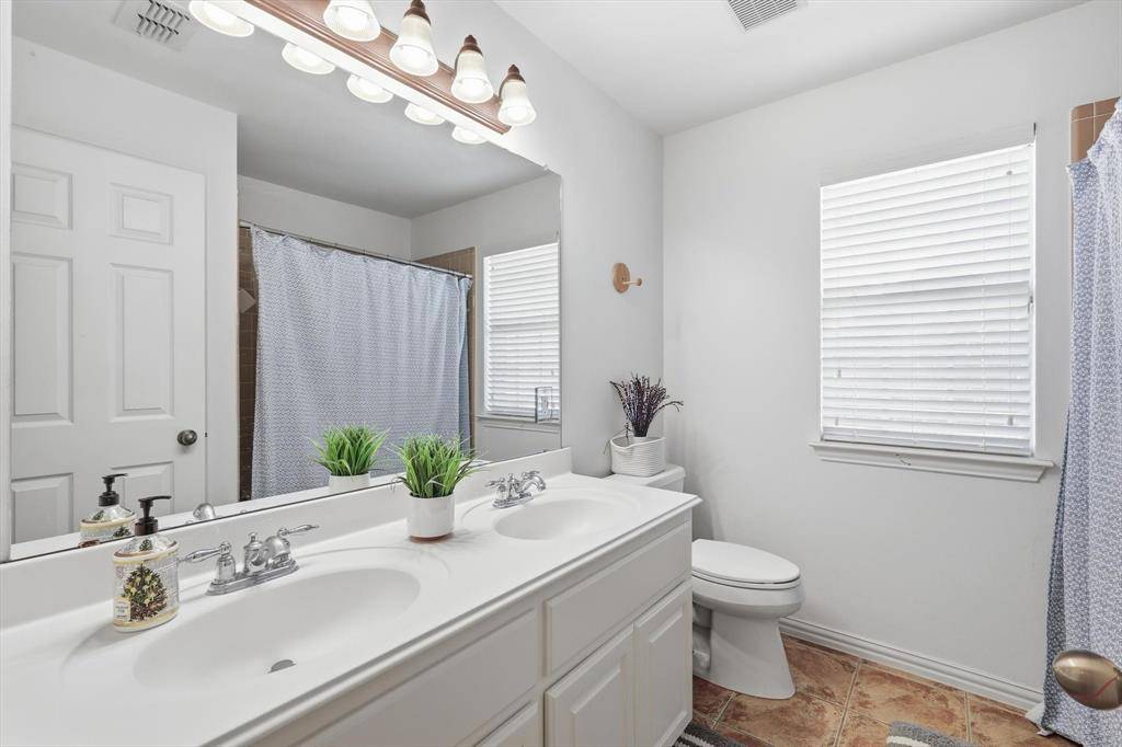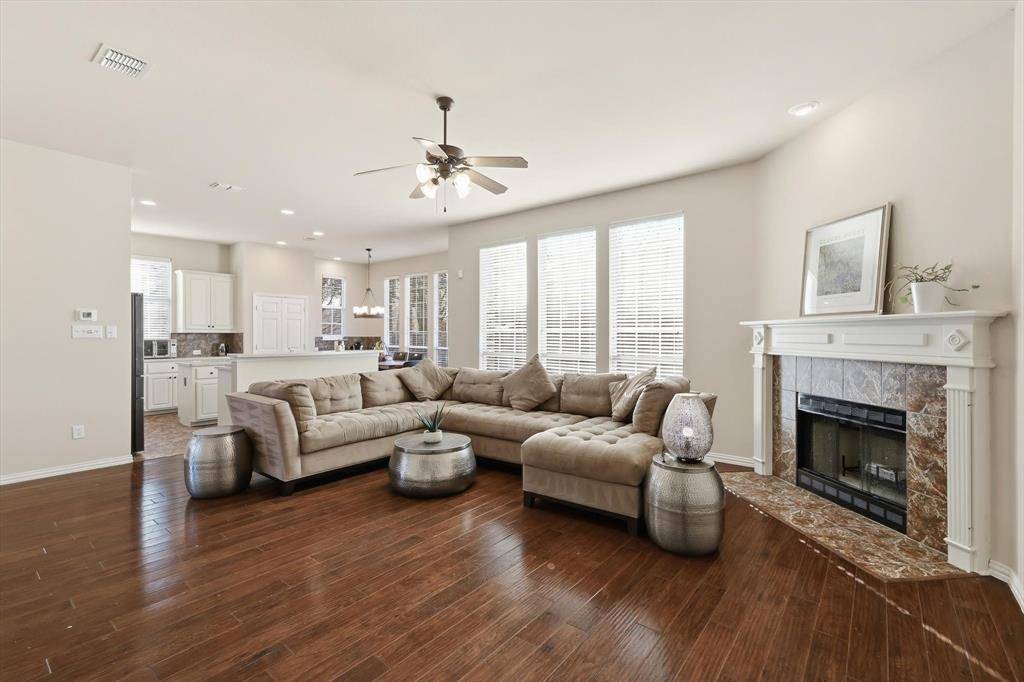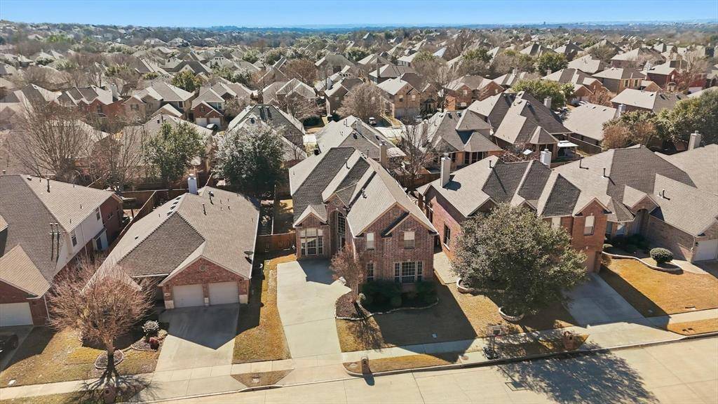 Welcome to this beautifully maintained two-story home in the highly sought-after Wellington community of Flower Mound. Known for its award-winning schools, scenic parks, and premier amenities, Wellington offers an exceptional lifestyle in the heart of Flower Mound. This spacious residence perfectly situated on a North East facing lot, features 5 bedrooms, 3 full bathrooms, formal living and dining areas, a large upstairs game room, and a two-car garage, offering the perfect blend of comfort, functionality, and space for entertaining. Step inside to discover rich hardwood flooring throughout the main living areas, designer paint tones, and abundant natural light. The inviting family room features a cozy fireplace and a wall of windows, creating a warm and welcoming gathering space.The island kitchen is ideal for everyday living and entertaining, offering extensive cabinetry, generous counter space, an electric cooktop, and a spacious breakfast area for casual dining. A first-floor guest bedroom and full bathroom provide flexibility for visitors or multi-generational living.The private primary suite offers a relaxing retreat, complete with a luxurious ensuite bathroom featuring dual vanities, a garden soaking tub, separate shower, and a spacious walk-in closet. Upstairs you'll find three additional bedrooms, a full bath, and a large game room, perfect for movie nights, play space, or a media area. Enjoy outdoor living in the private backyard featuring a large patio ideal for grilling, and entertaining.