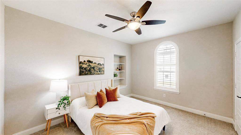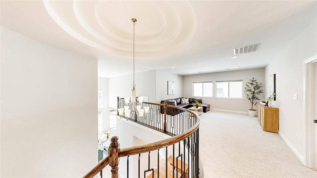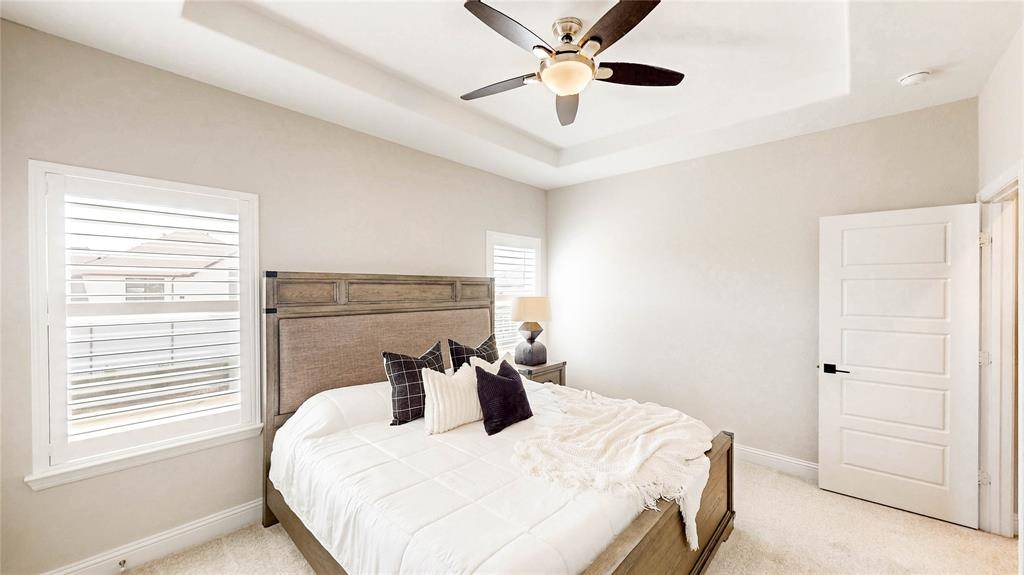 Zoned to highly sought-after Flower Mound schools, this exceptional home is located in a private gated community in Copper Canyon and offers the added benefit of a low tax rate. Ideally situated just moments from The Shops at Highland Village with easy access to FM 407 Justin Road, this location blends convenience with luxury living. Set on an east-facing corner quarter-acre lot, the home showcases stunning curb appeal with a beautiful stucco exterior, outdoor lighting, and a spacious 3-car garage. Inside, you're welcomed by a grand staircase, a private front office with French doors, and a large living room filled with natural light from abundant windows and excellent ventilation. Thoughtfully updated throughout, the home features plantation shutters and energy-efficient elements. The kitchen is equipped with stainless steel appliances and flows seamlessly into both the formal dining room and bright breakfast area. The downstairs primary suite offers a true retreat with an updated bath, separate tub and shower, and two walk-in closets—one with an additional access door for extra storage. A secondary bedroom downstairs provides flexibility for guests or multi-generational living, while the utility room adds character with stylish checkered tile. Upstairs, enjoy a spacious game room, media room, two additional bedrooms, and a full bath. The backyard is perfect for relaxing or entertaining, complete with a covered patio for year-round enjoyment.