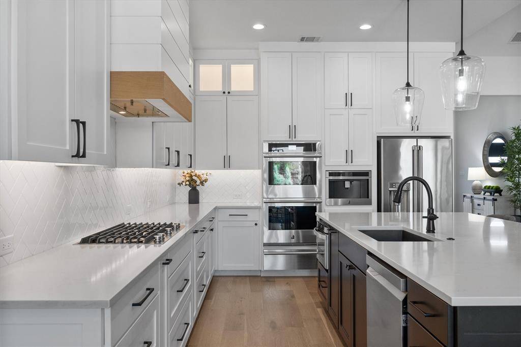 The kitchen is perfect for making memories and meals, with sleek quartzite countertops, double convection ovens, a warming drawer, a 5-burner gas stove, and a built-in coffee system. A concealed walk-in pantry with room for an additional refrigerator and prep space is just around the corner.