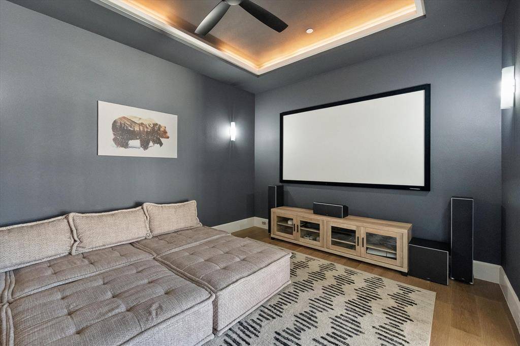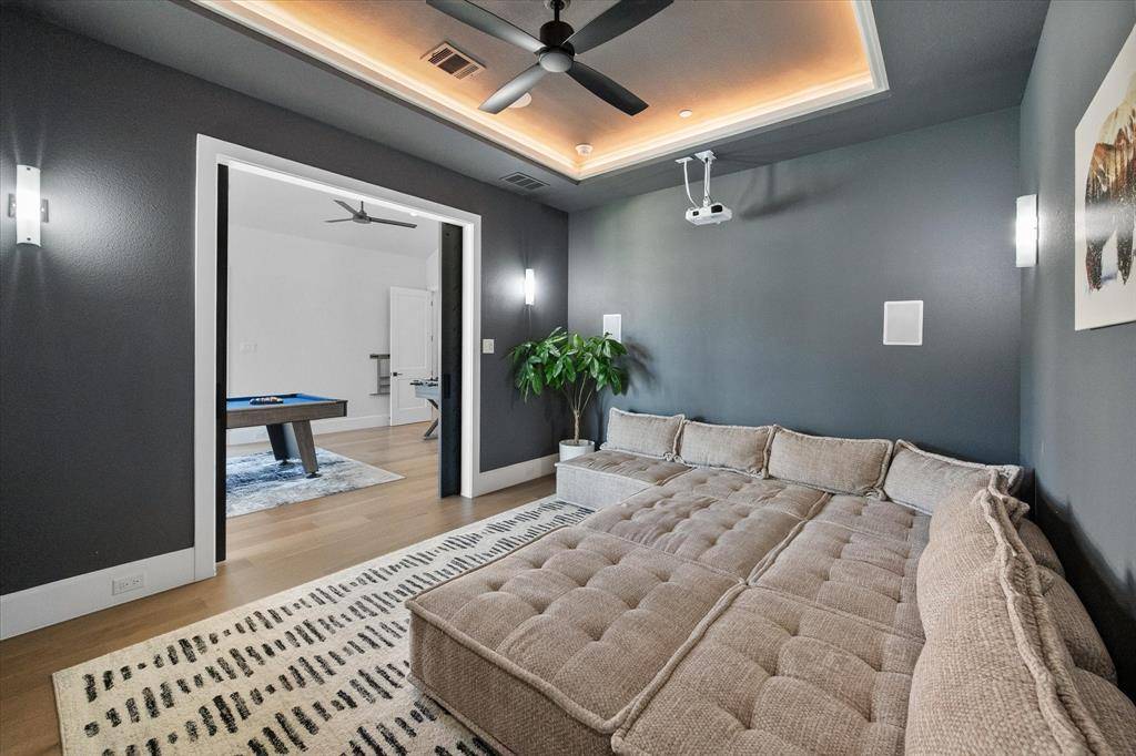 The living room features a dramatic linear fireplace and a wall of windows with sliding doors that open to the outdoor living space, heated saltwater diving pool, and expansive backyard. Just around the corner, a large game room offers so much flexibility with walls of windows and additional sliders to the pool. A media room provides the perfect spot to escape with a movie or to cheer on your favorite teams.