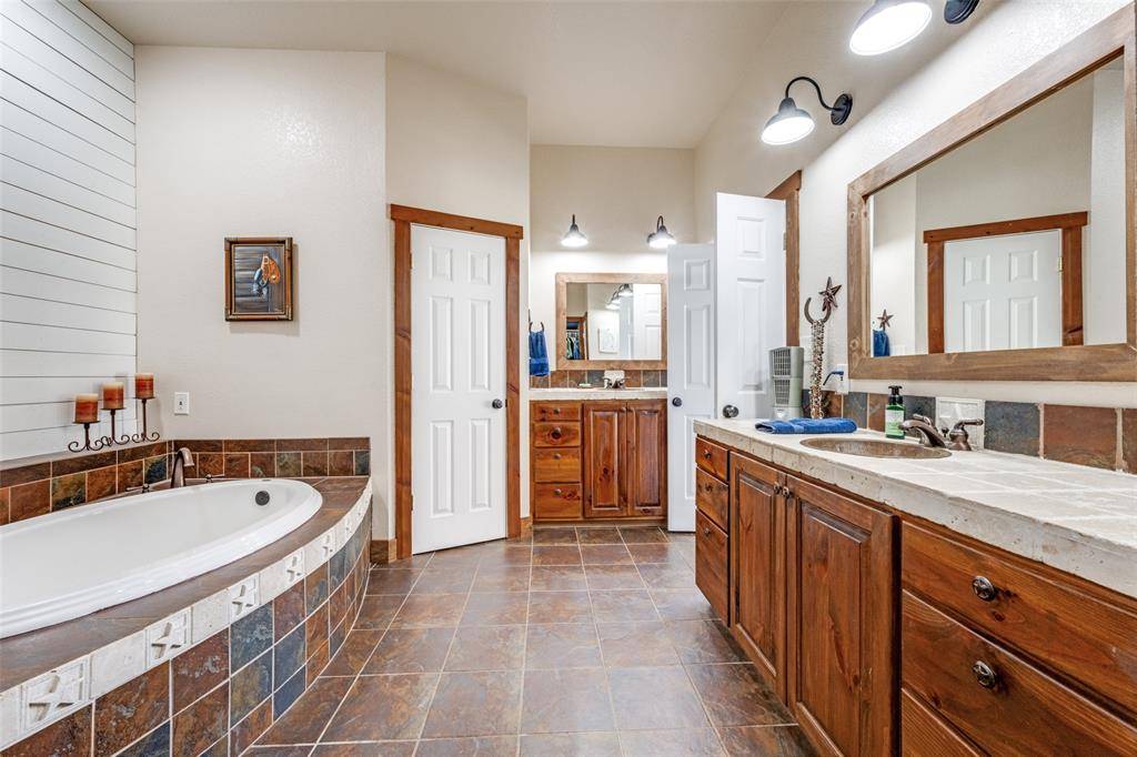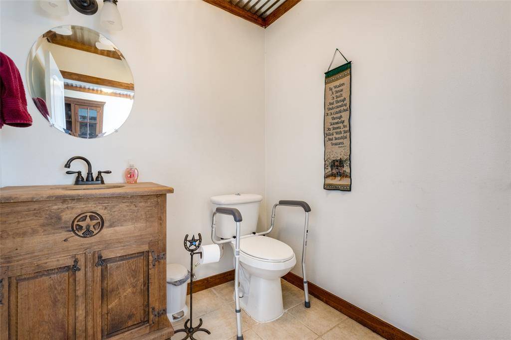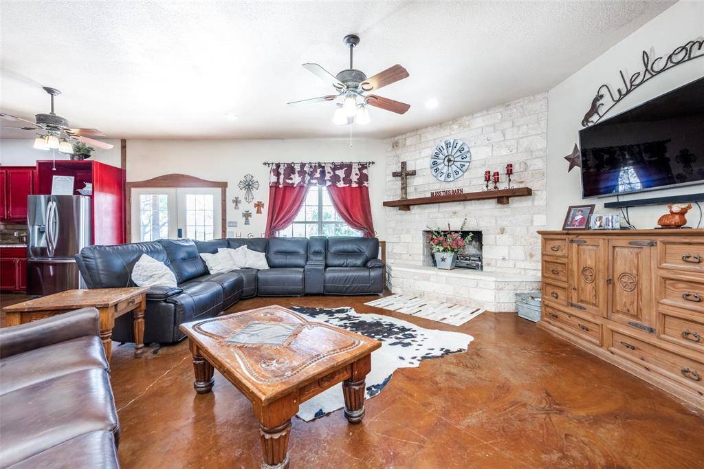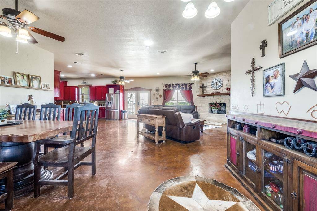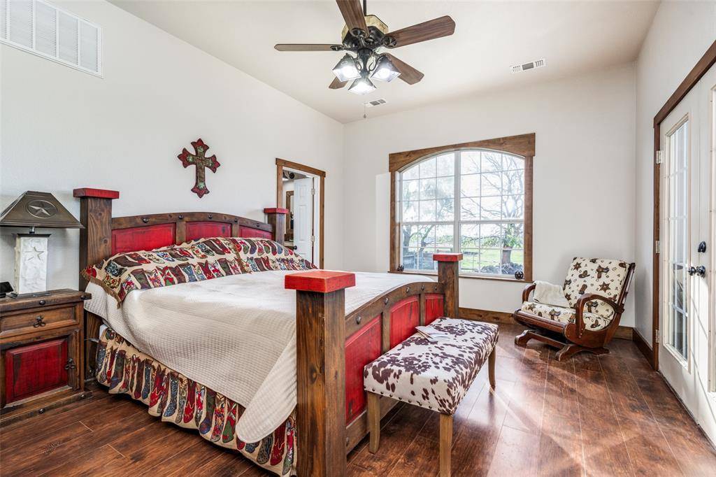 One of a kind property! AG EXEMPT! Custom farmhouse thoughtfully positioned on 32 acres in Justin. The main house has 3655 Sq Ft and the guest house has 1200 sq ft. As you enter you'll see the large great room with a corner stone fireplace, a spacious dining area & open kitchen. There is a private study with French doors. The kitchen features two copper sinks, a breakfast bar & an abundance of cabinet & counter space. There is a large game room that is a fun place to hang out with the family & friends. The primary bedroom is split for privacy & has doors to the back patio. The primary bath features a soaking bathtub, separate shower, & a large vanity space. The addition is a very large mud room loaded with cabinets & storage. 155 sq ft solid steel safe room with a solid steel door that is fireproof. The detached guest quarters offers a kitchen, living area, 2 BRS, 1.5 baths. The guest quarters is ADA compliant. The area above the game room was framed with 2x12 ceiling joists & AC ductwork was installed for a future living area if desired. The 40 x 50 workshop has a half bath & exterior hook up for an RV. Gated entrance, fully fenced with cross fencing & smaller pastures for your animals, 6 working pens with water plumbed to each and water plumbed to pastures; water well; 2 ponds; large front and back porches; metal roof. This property has so much to offer!