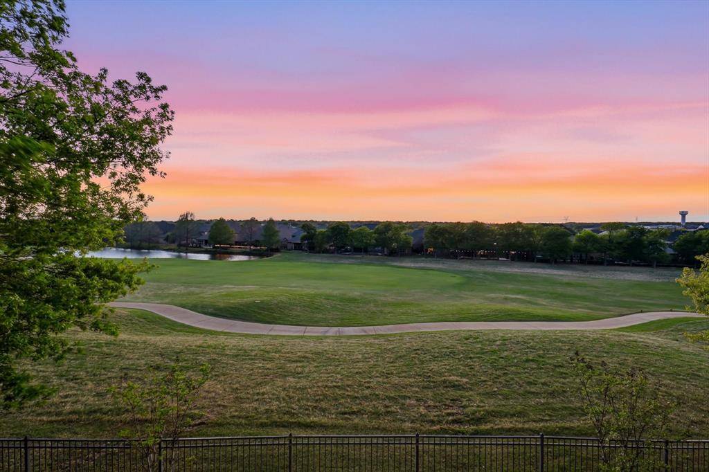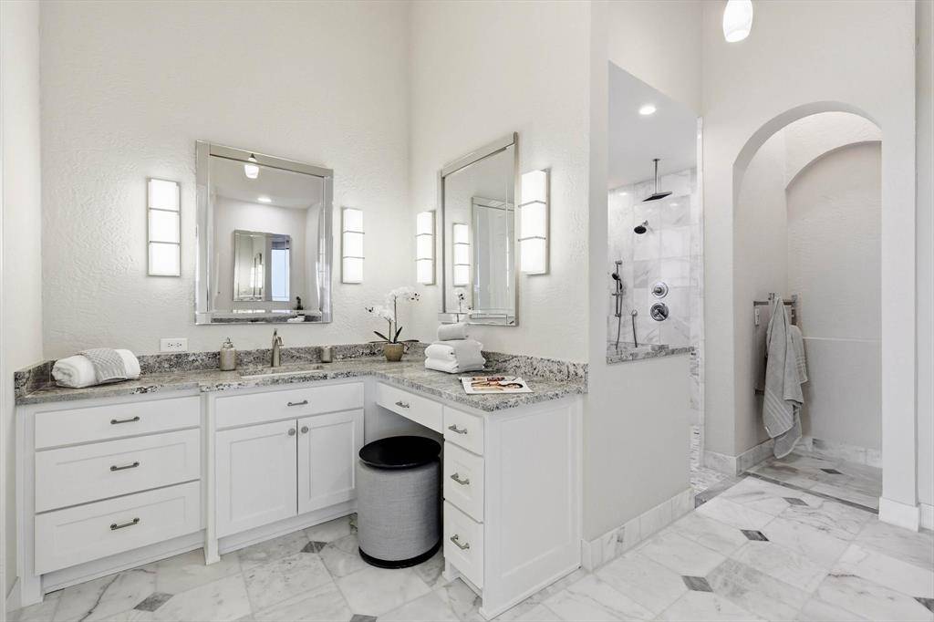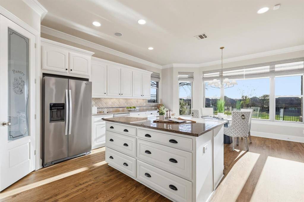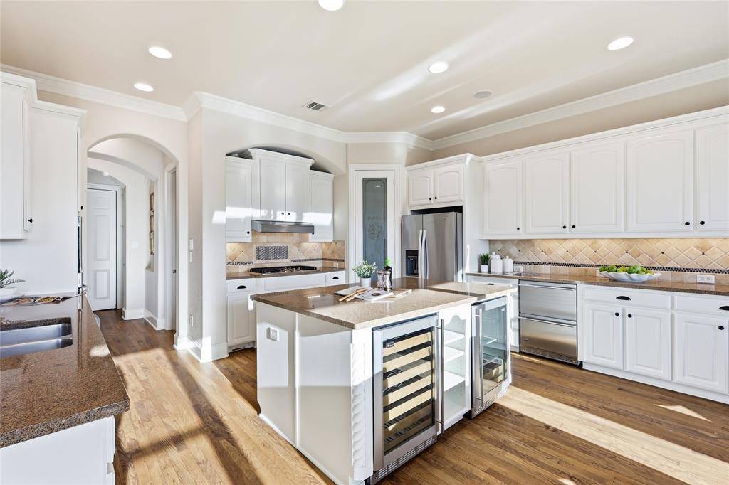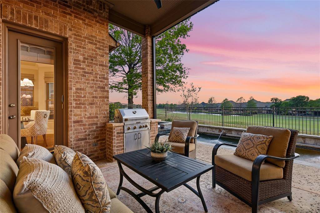 BRAND NEW TO MARKET & MOVE-IN READY! Luxury living on the 13th fairway with breathtaking, panoramic GOLF COURSE & WATER VIEWS. A perfect blend of elegance, comfort, & thoughtful design—paired with an easy to maintain backyard oasis. Your private retreat features a sparkling SALTWATER POOL & SPA, a charming arbor ideal for al fresco dining & a covered patio complete with a BUILT IN GRILL & AUTOMATIC SCREEN—allowing for seamless, year-round indoor-outdoor living. Inside, PRIDE OF OWNERSHIP shines at every turn. The home has been EXTENSIVELY REFRESHED with NEW PAINT throughout—including cabinetry, beautifully REFINISHED GENUINE HARDWOOD FLOORS in a versatile mid-tone chestnut color, brand NEW CARPET & PAD upstairs, and UPDATED LIGHTING with added recessed cans. The primary bathroom has been fully remodeled, showcasing a HUGE MARBLE SHOWER and even NEW CABINETRY. Natural light pours in highlighting SOARING CEILINGS and framing the stunning golf course & lake views. The thoughtfully designed 5 way SPLIT BEDROOM floor plan offers both PRIVACY and flexibility, including a downstairs MOTHER-IN-LAW SUITE with ensuite bath, as well as a luxurious primary suite with sitting area & direct patio access. A Texas-sized home office with a cozy gas fireplace creates the perfect work-from-home space. The expansive family room flows seamlessly into the chef's kitchen with a large island, GAS COOKTOP, stainless steel appliances, rich granite countertops, & exceptional storage—including a walk-in pantry, butler's pantry, full-size refrigerator, TWO WINE FRIDGES & 2 built-in COLD STORAGE DRAWERS. Upstairs, enjoy 3 bedrooms—one with a private ensuite and two connected by a Jack-and-Jill bath—along with an OVERSIZED GAME ROOM featuring a FULL WET BAR KITCHEN. An adjacent FLEX ROOM could be used for a home theater, fitness space, or home school room. A powder bath & private balcony complete the upper level. HUGE LAUNDRY ROOM WITH SINK, 3-CAR GARAGE with fresh EPOXY FLOORS, CLASS IV ROOF!