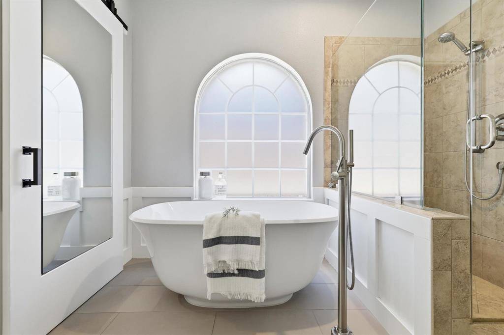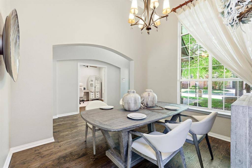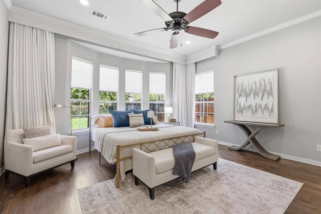 Welcome to this beautifully updated 5-bedroom home in the highly sought-after Wellington community in Flower Mound, just steps from the amenity center and all three top-rated LISD schools. Inside, hand-scraped hardwood floors guide you through a dedicated home office and elegant, formal dining space into a light-filled, open-concept living area. The updated kitchen flows seamlessly into the inviting living room, creating the perfect setting for both everyday living and effortless entertaining. The first-floor primary suite offers a tranquil, private retreat with custom built-ins, a spa-like ensuite bath, and a calming ambiance and serene views designed for true relaxation.