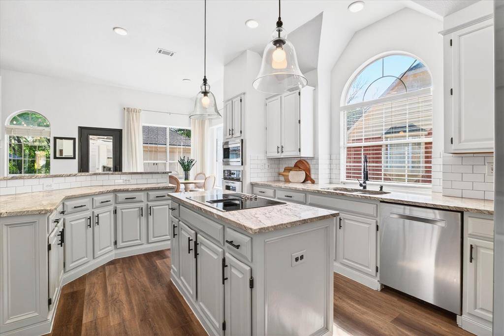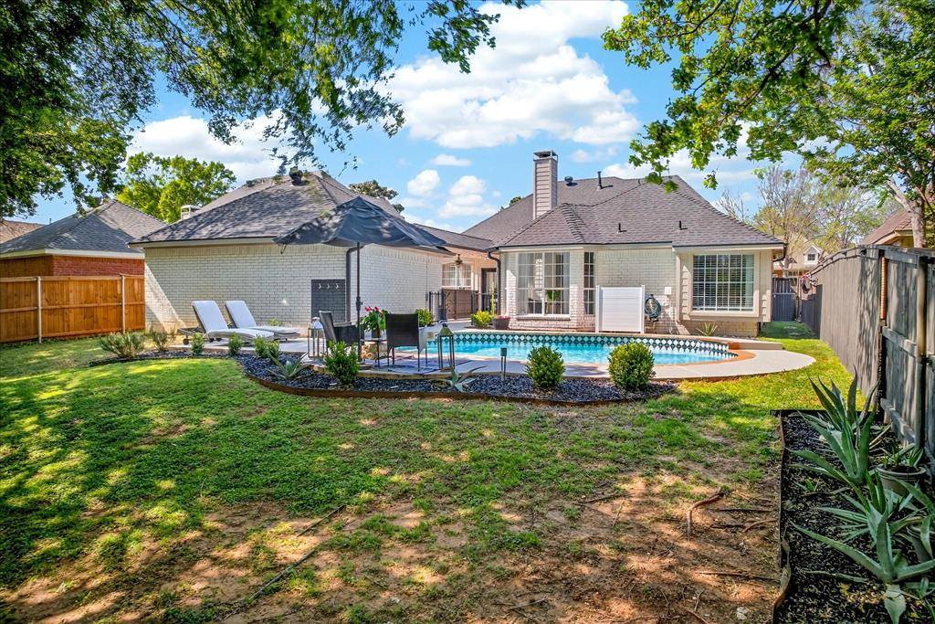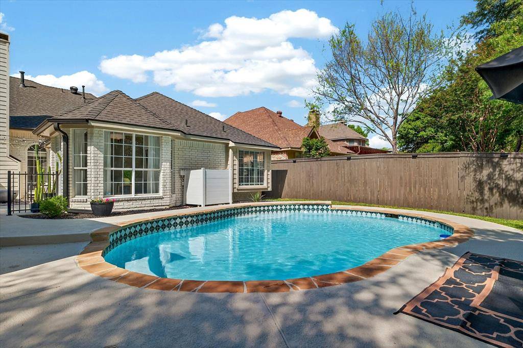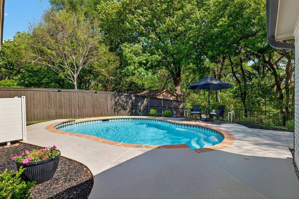 Single-story home on a premium greenbelt lot in Creekside at Cross Timbers—an uncommon combination of privacy, pool, and layout that's hard to find!!! Set within a highly desirable neighborhood known for its wide streets, mature trees, and newly updated parks, the setting feels established, quiet, and well-spaced. With no rear neighbors and tree coverage behind, the backyard feels like a TRUE oasis. The floor plan is both functional and flexible, with a dedicated study behind French doors at the front and a formal dining room with detailed millwork. The main living area is bright and open, centered around a fireplace and framed by large windows that bring in natural light throughout the day, all connected seamlessly to the kitchen for easy everyday living and entertaining. The kitchen is designed for real use, with an island cooktop, wraparound seating, granite countertops, subway tile backsplash, and direct connection to the breakfast area. The primary suite is set privately at the back of the home and includes a versatile sitting area that can flex as an office, nursery, or workout space, plus an en-suite bath with dual vanities, jetted tub, separate shower, and walk-in closet. Direct patio access makes the indoor-outdoor flow feel natural and intentional. The backyard backs to a gorgeous greenbelt and features a pool with extended patio space that allows for multiple seating areas, perfect for outdoor parties! The neighborhood is one of the most coveted in the area, as it is zoned to FMHS, is centrally located to both North and South Flower Mound amenities, and *gorgeous walking, running and bike trails, that you don't even have to leave the sidewalk to access!*. Meticulously maintained and move-in ready, offering a rare opportunity to own a single-story with this level of privacy, outdoor living, and layout in one of Flower Mound's most sought-after communities!