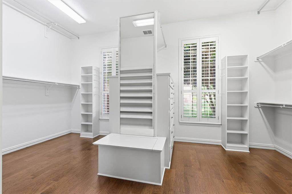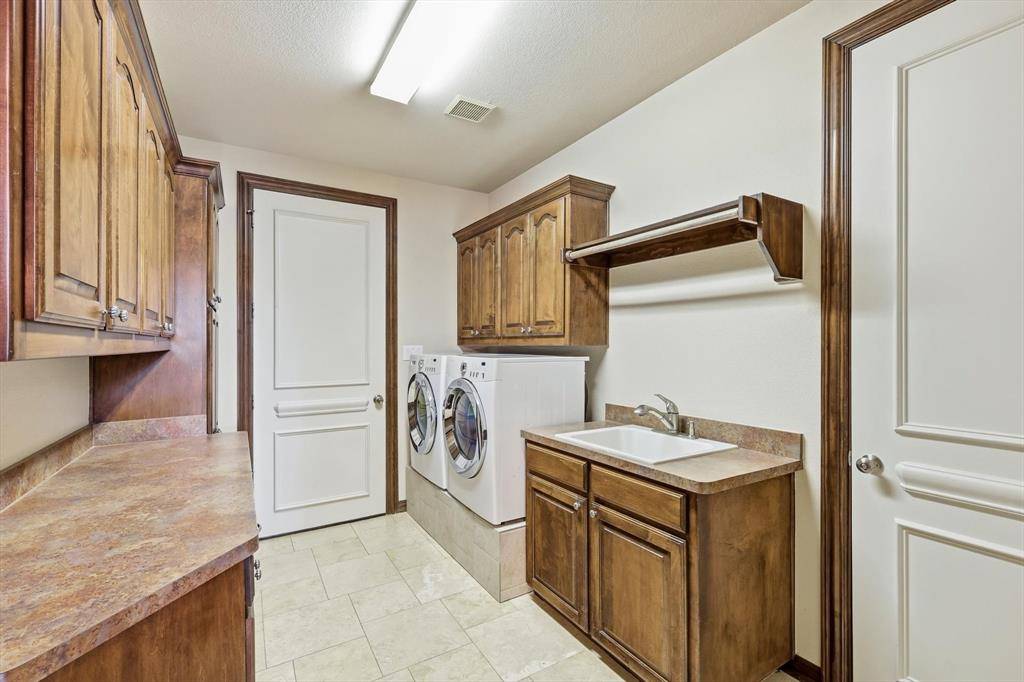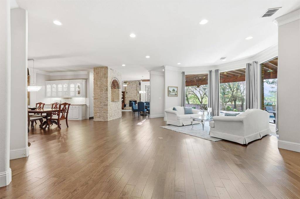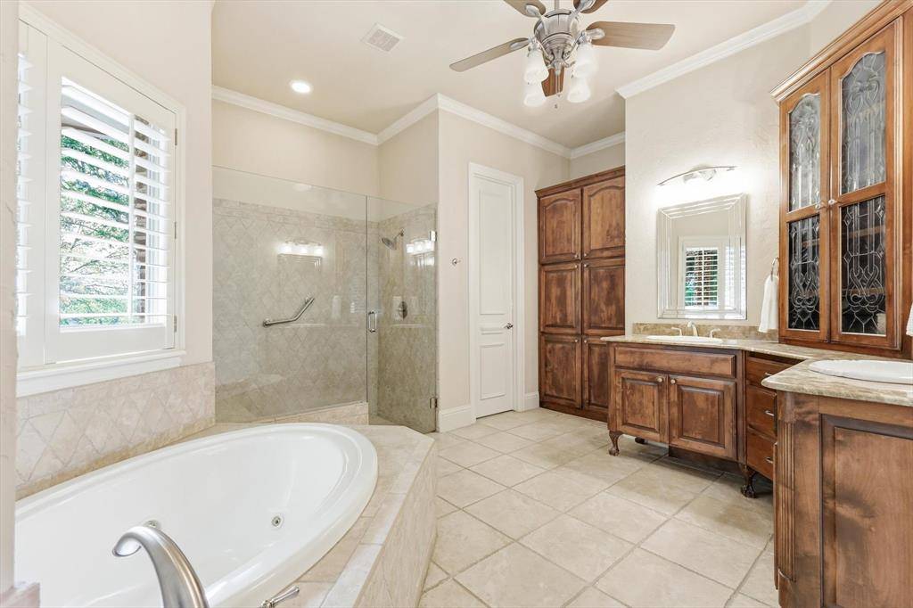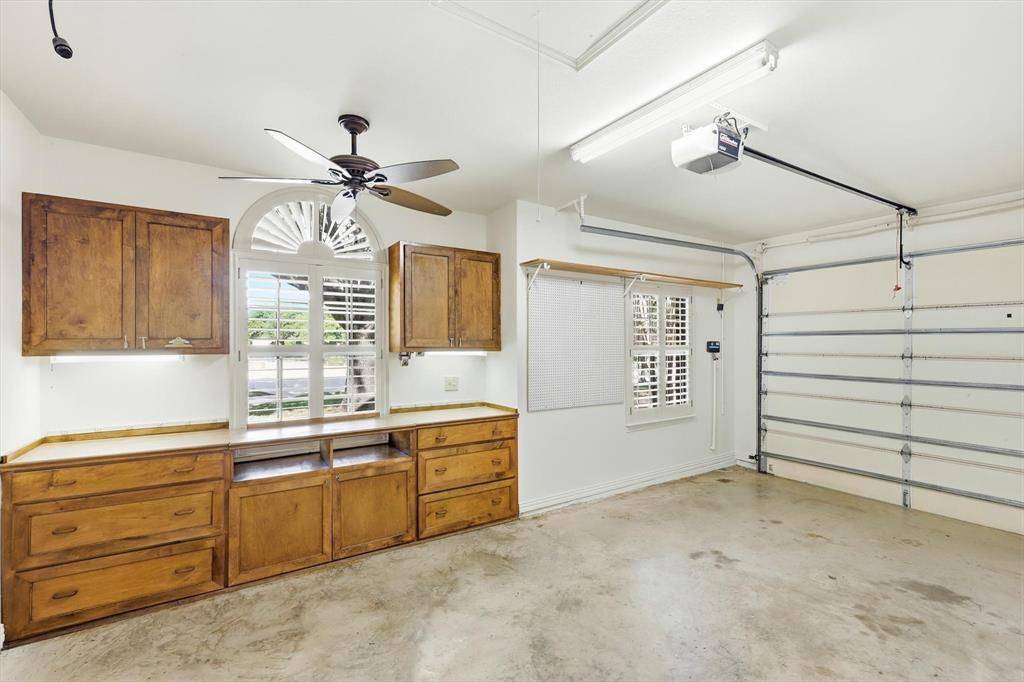 Storage is exceptional, with abundant cabinetry, closets, walk-in attic, and four-car garage. One bay is climate-controlled and outfitted as a workshop.