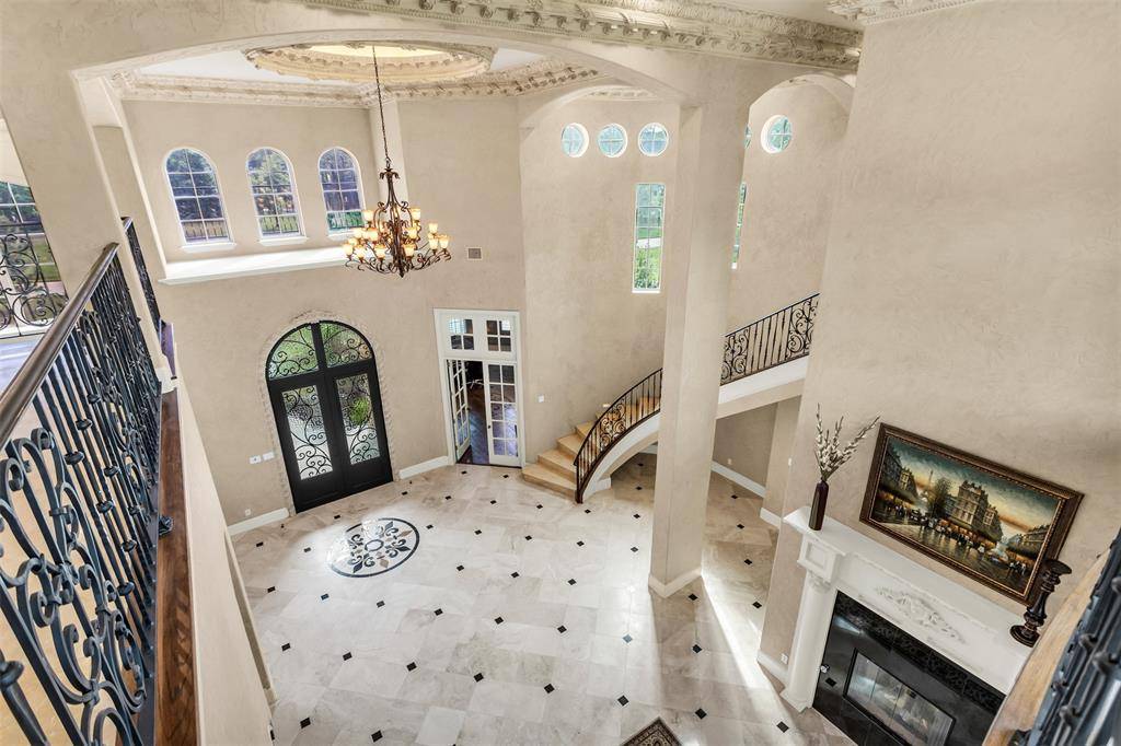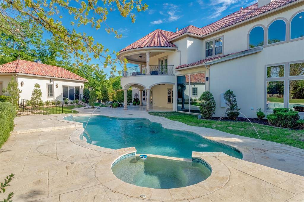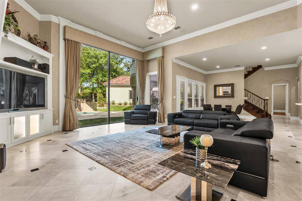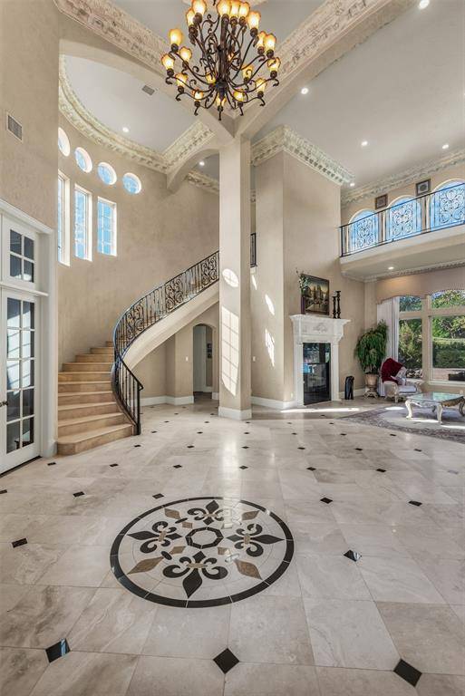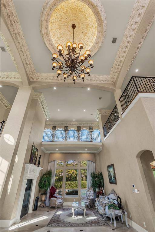A stunning Mediterranean estate designed for those who love to entertain and live exceptionally well, this 7,499 square foot residence sits on 1.82 acres in a cul-de-sac on the golf course within the prestigious Estates at Tour 18, a 24-7 guarded and gated community. From the moment you step inside, soaring 25-foot ceilings create a dramatic and inviting presence, setting the tone for a home that is both grand and welcoming. Designed for hosting on any scale, the home features a dedicated media room, an large game room with kitchenette, and seamless indoor-outdoor living. The resort-style backyard offers a sports court, pool, and an impressive gas firepit, making it the perfect setting for unforgettable gatherings. At the heart of the home, the oversized kitchen is as functional as it is beautiful, featuring dual dishwashers, a vegetable sink, and striking lighted Cristallo countertops. Around the corner, a built-in desk area provides space for homework or everyday organization. The secluded master suite is a true retreat, complete with a sitting area. A versatile bonus room with a closet, ideal for a nursery, private office, craft room, or additional storage is nearby. The spa-like master bath offers a steam shower, rain head, and a towel warmer for a true luxury experience. Three additional bedrooms are upstairs, including one with its own balcony. A separate guest house offers comfort for extended stays or multigenerational living. Every detail has been carefully chosen, from marble countertops in all bathrooms to a central vac system, electronic window treatments, and chandeliers that lower electronically for easy maintenance. Set within one of the area's most sought-after gated communities with scenic golf course views, this home offers a rare combination of privacy, scale, and elevated living. You can keep searching… but you won't find another one like this. Many furnishings in the home are available for purchase.