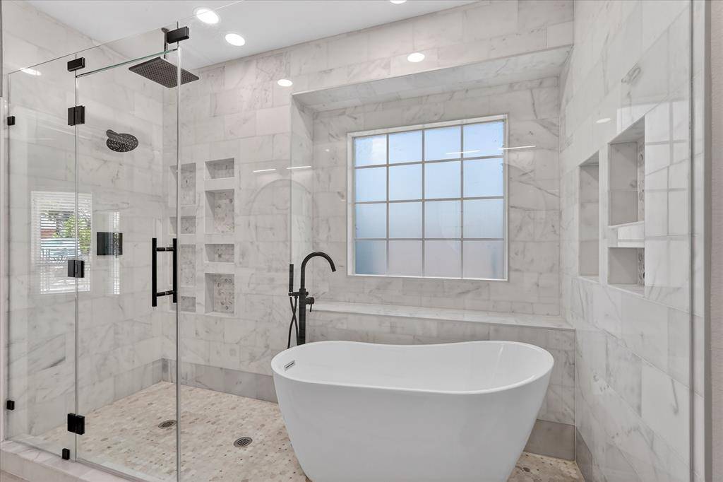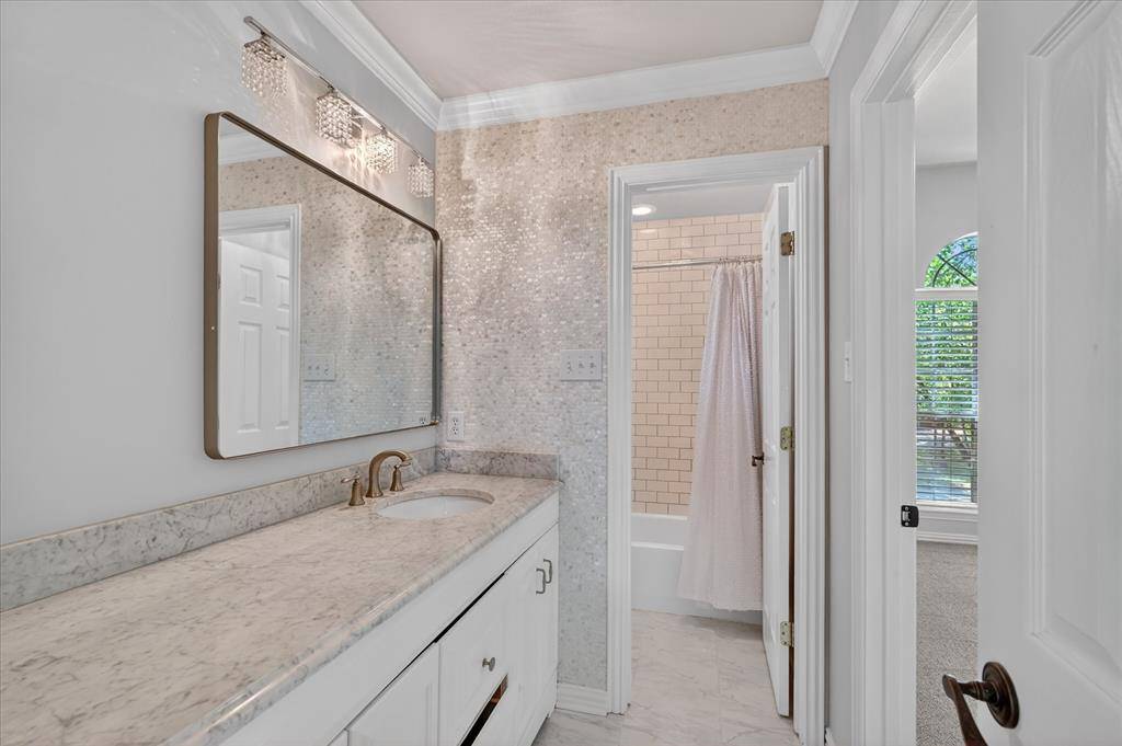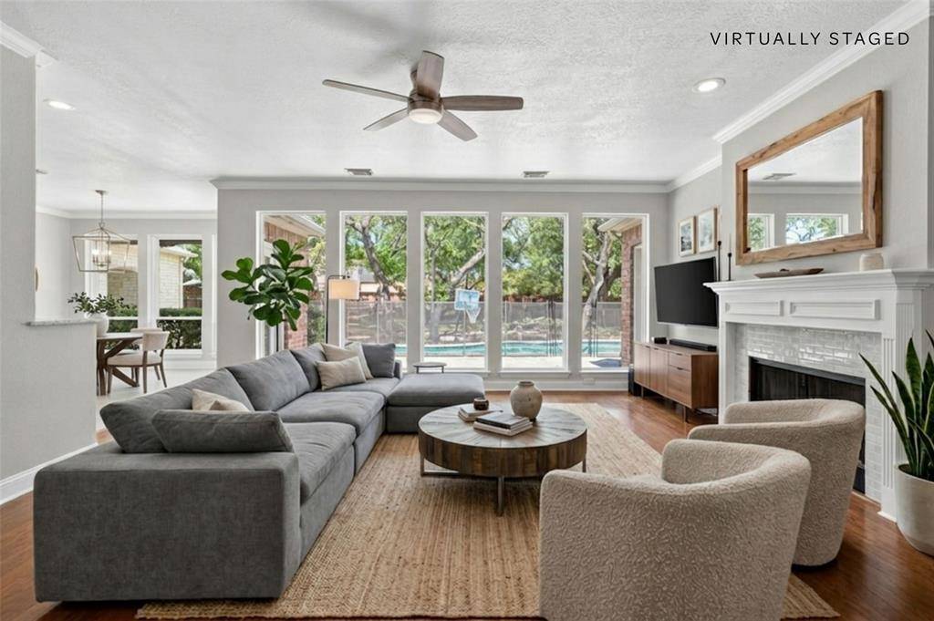 Stunning, spacious home in a prime location! Rare opportunity in Pecan Park Estates—a quiet, single-street community offering privacy and charm. Situated on an impressive .43-acre lot surrounded by gorgeous mature trees, this property delivers the perfect blend of indoor comfort and outdoor living. The backyard is an entertainer's dream, featuring a gated pool and spa, expansive grassy area, and an incredible outdoor living center complete with a stone fireplace, built-in grill, cabinetry, vaulted wood ceiling, and ample seating space—ideal for year-round gatherings. Inside, you'll find a beautifully updated interior with warm wood flooring, fresh paint, arched doorways, crown molding, and modern light fixtures. The spacious kitchen is equipped with granite countertops, dual ovens, a 6-burner gas cooktop, abundant cabinetry, and a sunny eat-in dining area. The light-filled living room showcases high ceilings, fireplace, and a wall of floor-to-ceiling windows overlooking the backyard. The tranquil primary suite offers private access to the outdoors and serene views, along with a fully remodeled spa-like bathroom featuring a custom vanity and a luxurious wet room with a soaking tub and walk-in shower, plus marble finishes throughout. The main level also includes a dedicated office with built-ins, formal dining and living spaces, and a convenient half bath. Upstairs, enjoy fresh carpet, updated bathrooms, a spacious game room, and three additional bedrooms—one with an ensuite bath and two connected by a Jack-and-Jill bathroom. A walk-in attic with built-in shelving provides exceptional storage. Designed for both everyday living and unforgettable entertaining, this home is the perfect retreat for Texas summers and beyond!