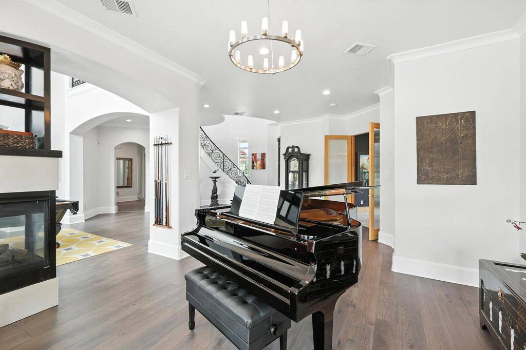 Primary suite with a dual sided fireplace, a spa bath with a waterfall & a jetted tub. The Kitchen has top of the line appliances including a double door Sub Zero & a Kitchen Aid 6 burner cook top. The downstairs also features a media room with a huge wet bar and theater seating Car enthusiasts will love the oversized four-car garage with all new glass doors & an extra parking pad, and portico for showcasing vehicles. The casita provides a private suite with a full bath ideal for guests or extended family members. The second floor features 5 bedrooms with spacious closets and en suite bathrooms.