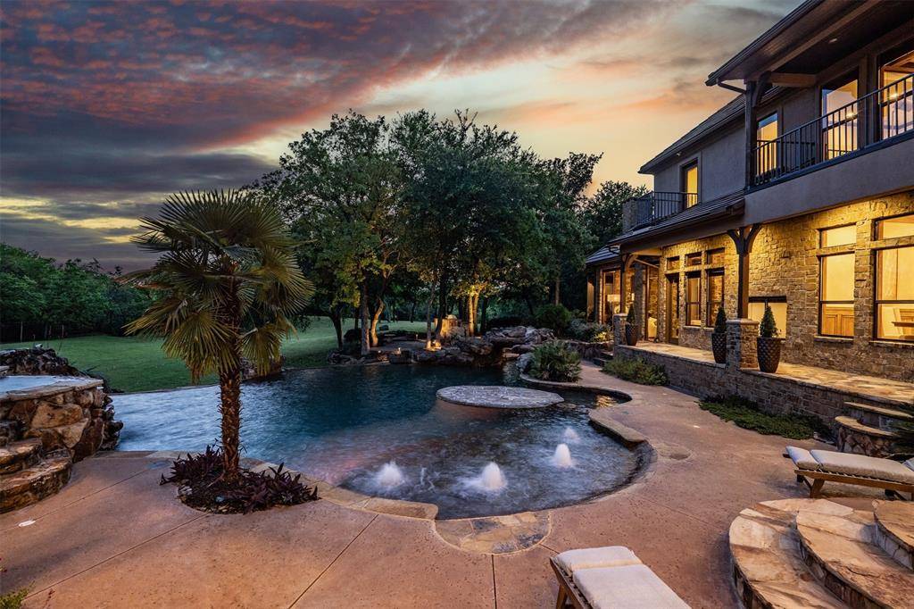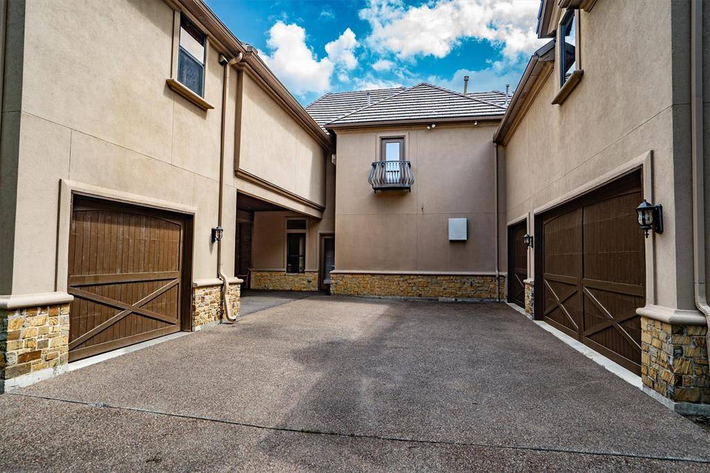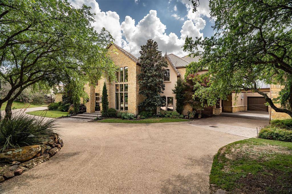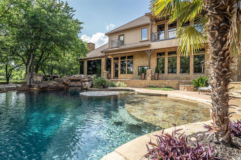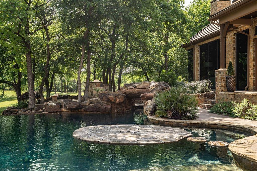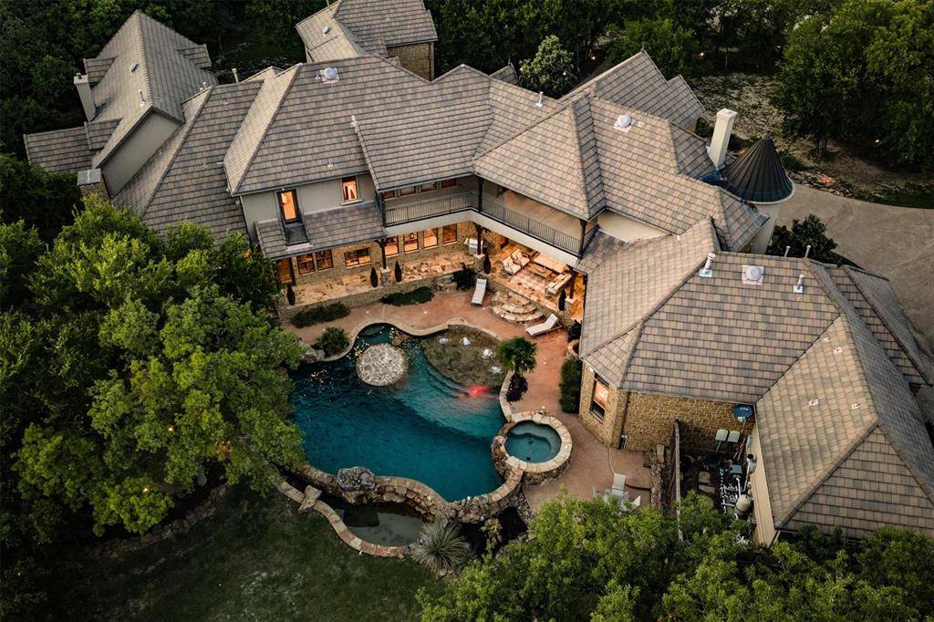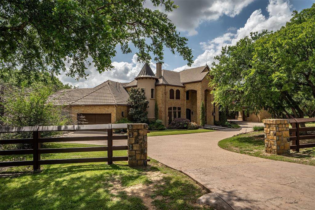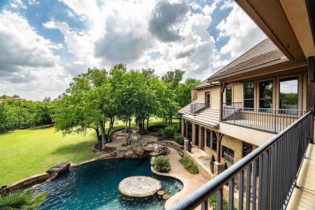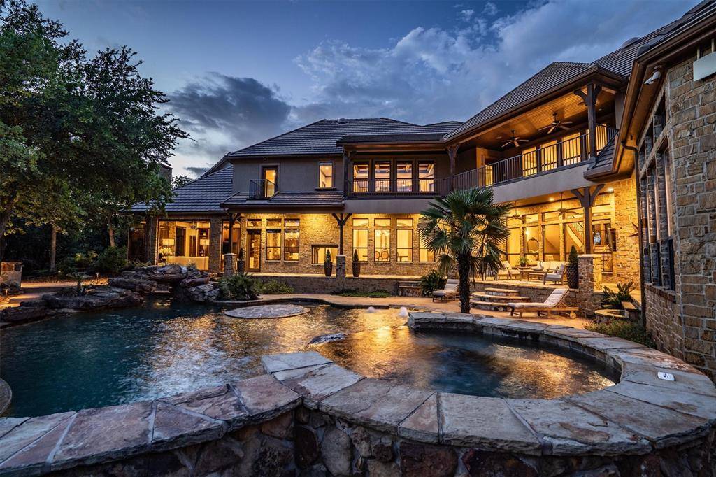 Tucked away on over 2 private acres, surrounded by multi-million-dollar estates, this 5-BR home w. no HOA beautifully blends luxury, comfort & natural beauty, backing to Army Corps of Eng. land along Grapevine Lake for exceptional privacy & serene views. Step thru the marble-tiled grand foyer w. soaring 2-story ceilings & immediately take in the view of the breathtaking backyard oasis. Rich woodwork, elegant chandeliers & 6 FPs create a warm yet sophisticated atmosphere thru-out this home. A car enthusiast's dream: 4 garages (1 w. lift, 1 tandem) accommodate up to 8 vehicles. The private owner's wing offers a primary suite w. tray ceiling, FP & sitting area overlooking the grounds. The spa-inspired bath features dual vanities, oversized shower, flows into an enormous custom WI closet. Just outside are a dedicated office & private garage access. In the opposite wing, a secondary suite w. sitting area, ensuite bath & WI closet sits across from the formal dining. A wet bar adjacent to the breakfast rm opens to the outdoor living via a convenient pass-thru window. The chef's kitchen is fully equipped w. BI fridge, dbl ovens, 6-burner gas cooktop, expansive island w. prep sink & brkfst bar, all opening to a sunlit brkfst area. Triple stone arches lead to the living rm w. coffered ceiling, floor-to-ceiling stone FP, built-ins & walls of windows. Upstairs, a private wing features an expansive media rm w. wet bar. Down the hall, a 2nd family rm w. coffered ceiling & bar area opens to a balcony overlooking the pool & tranquil grounds. 3 additional BRs, 2 w. corner FPs & private balconies, feature ensuite baths & WI closets. A massive game room w. FP & wine bar is accessible via a staircase from the LR downstairs, while separate guest quarters include a living & kitchen area, full bath & private garage access. Outdoors, unwind in the resort-style backyard w. covered patio, sparkling pool w. spa & grotto, a lush lawn framed by mature trees beyond. Your own private sanctuary!