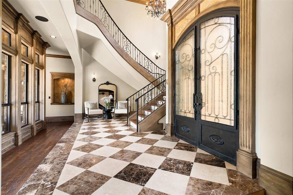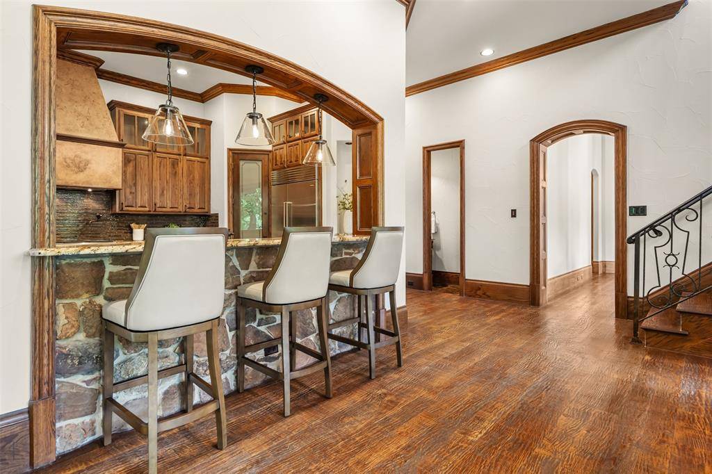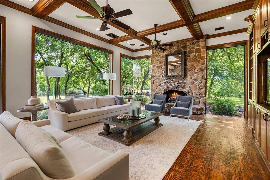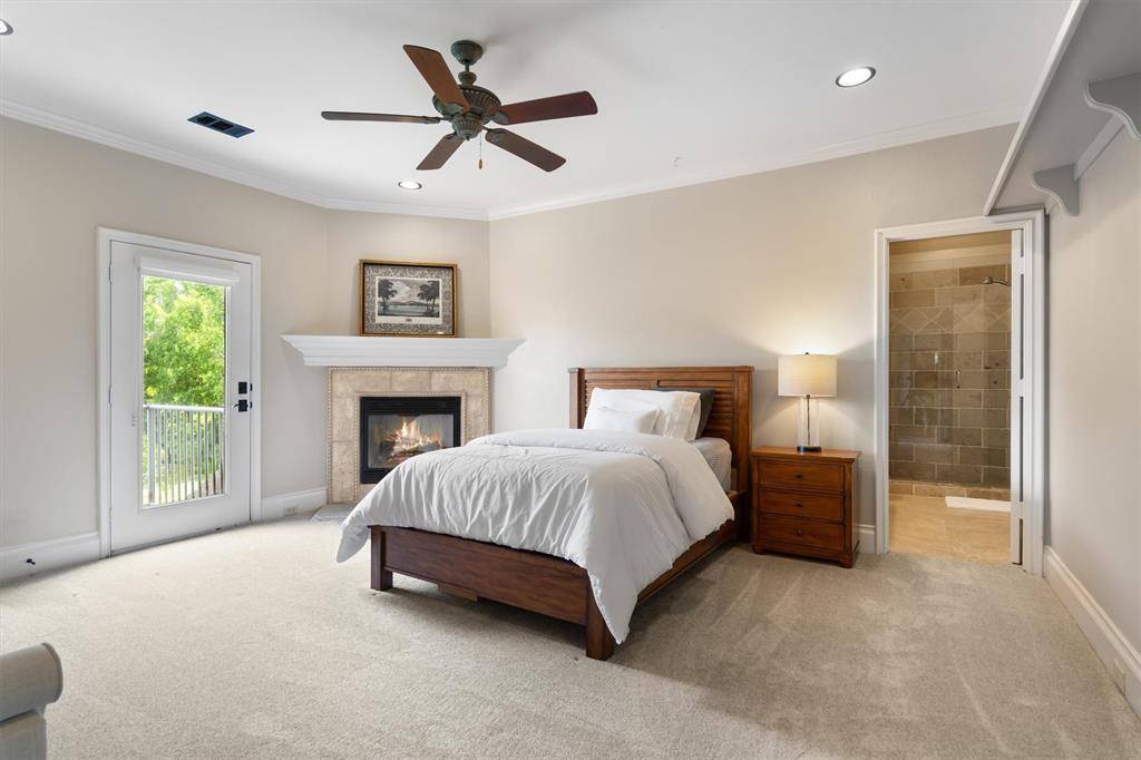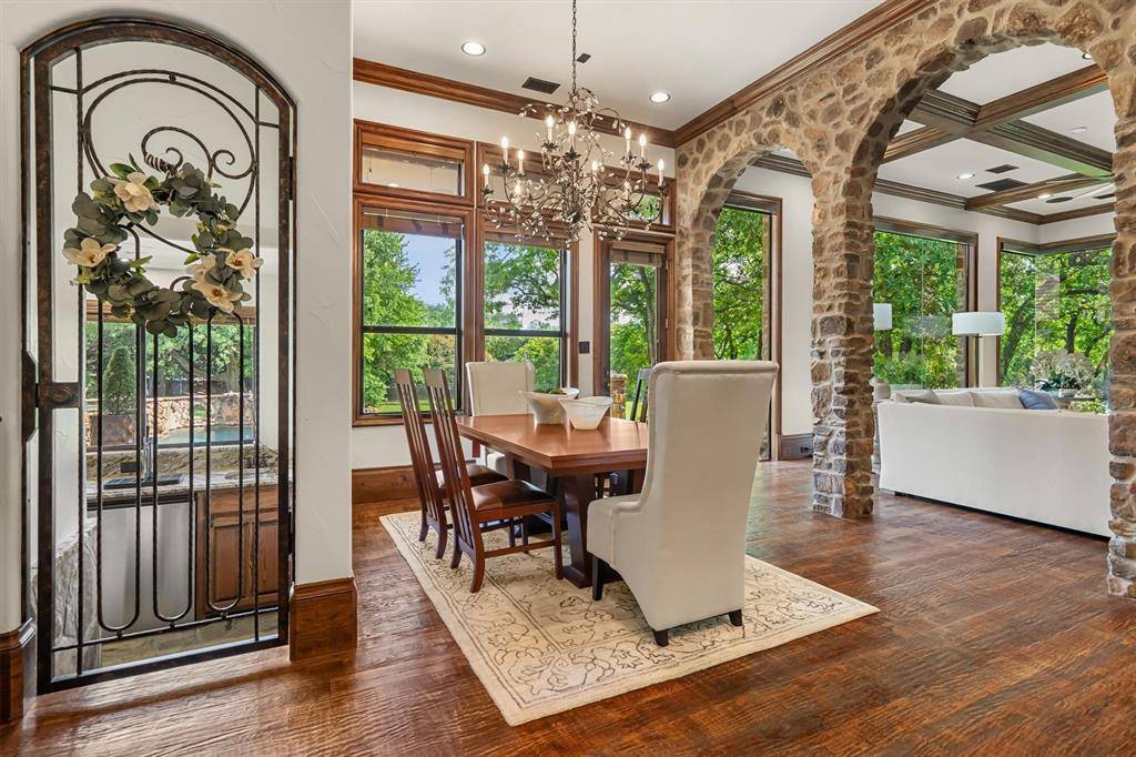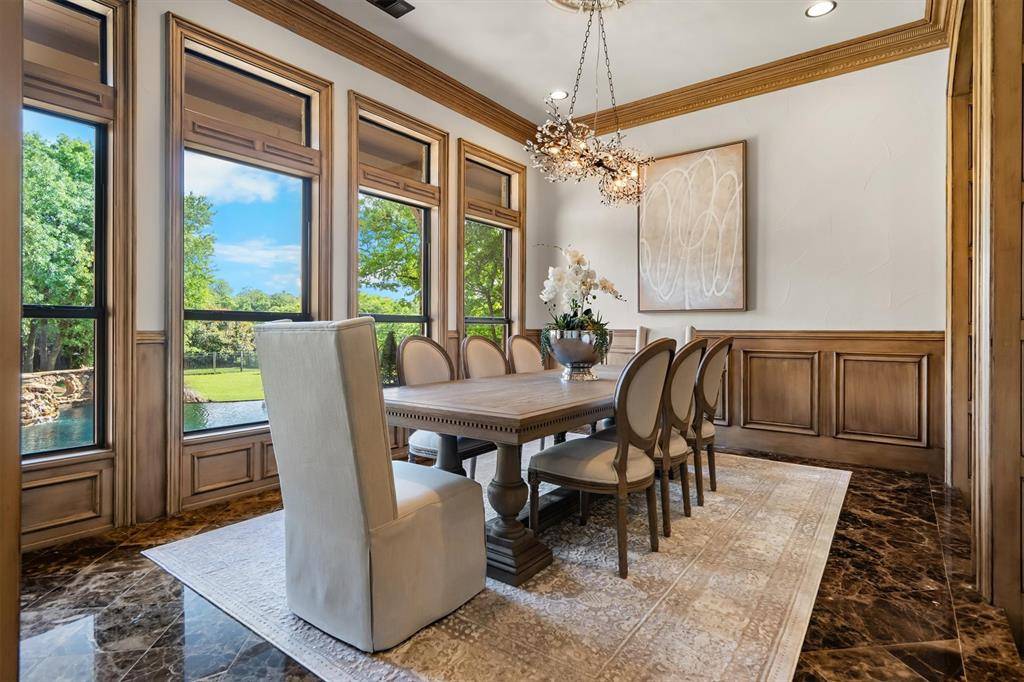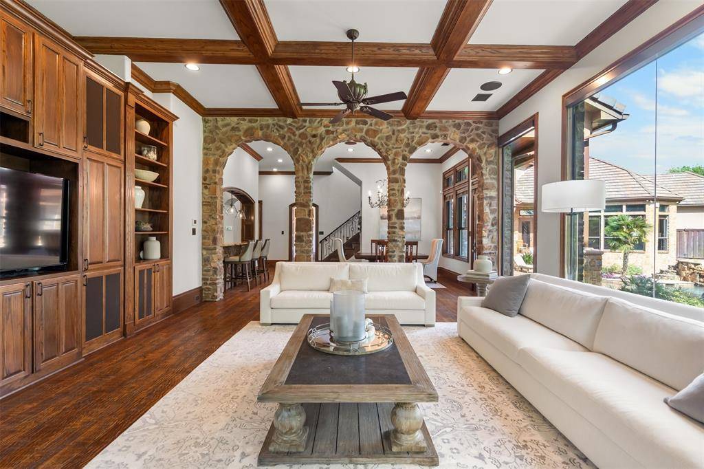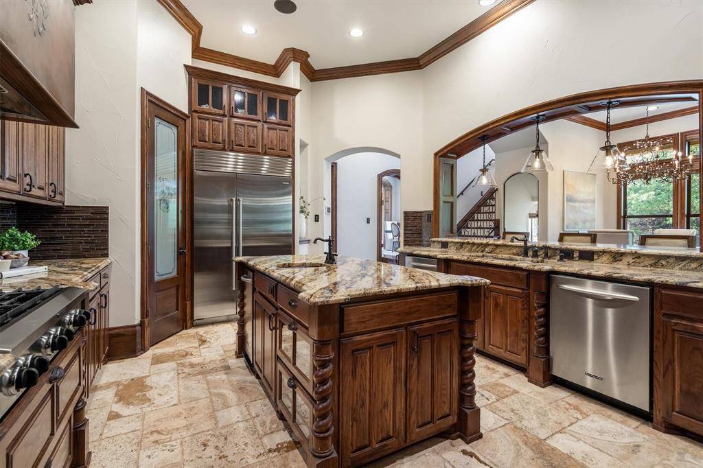 Tucked away on over 2 private acres, surrounded by multi-million-dollar estates, this 5-BR home w. no HOA beautifully blends luxury, comfort & natural beauty, backing to Army Corps of Eng. land along Grapevine Lake for exceptional privacy & serene views. Step thru the marble-tiled grand foyer w. soaring 2-story ceilings & immediately take in the view of the breathtaking backyard oasis. Rich woodwork, elegant chandeliers & 6 FPs create a warm yet sophisticated atmosphere thru-out this home. A car enthusiast's dream: 4 garages (1 w. lift, 1 tandem) accommodate up to 8 vehicles. The private owner's wing offers a primary suite w. tray ceiling, FP & sitting area overlooking the grounds. The spa-inspired bath features dual vanities, oversized shower, flows into an enormous custom WI closet. Just outside are a dedicated office & private garage access. In the opposite wing, a secondary suite w. sitting area, ensuite bath & WI closet sits across from the formal dining. A wet bar adjacent to the breakfast rm opens to the outdoor living via a convenient pass-thru window. The chef's kitchen is fully equipped w. BI fridge, dbl ovens, 6-burner gas cooktop, expansive island w. prep sink & brkfst bar, all opening to a sunlit brkfst area. Triple stone arches lead to the living rm w. coffered ceiling, floor-to-ceiling stone FP, built-ins & walls of windows. Upstairs, a private wing features an expansive media rm w. wet bar. Down the hall, a 2nd family rm w. coffered ceiling & bar area opens to a balcony overlooking the pool & tranquil grounds. 3 additional BRs, 2 w. corner FPs & private balconies, feature ensuite baths & WI closets. A massive game room w. FP & wine bar is accessible via a staircase from the LR downstairs, while separate guest quarters include a living & kitchen area, full bath & private garage access. Outdoors, unwind in the resort-style backyard w. covered patio, sparkling pool w. spa & grotto, a lush lawn framed by mature trees beyond. Your own private sanctuary!