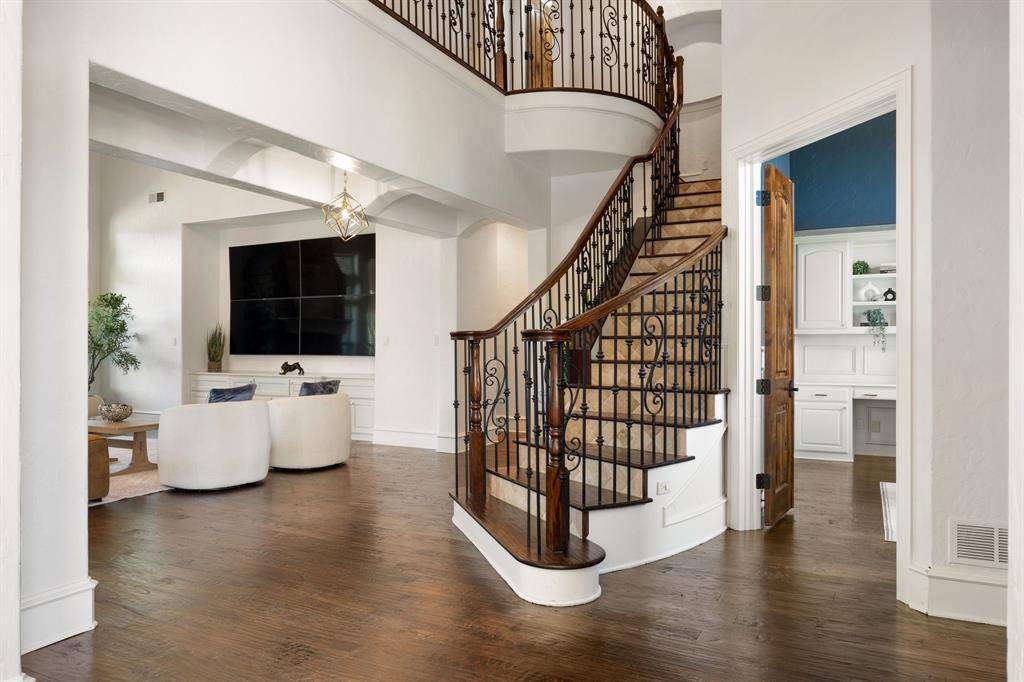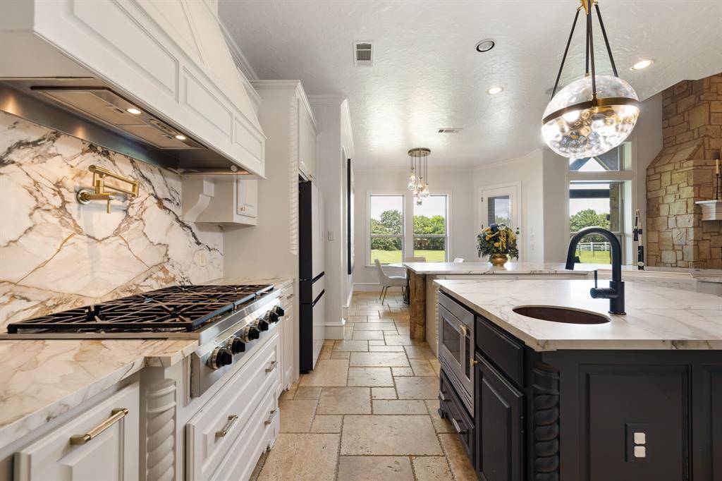 Welcome to Bartonville—where horses and exotic cars share the same scenic roads. Tucked behind a private gate on 2.5 acres, this beautifully renovated home offers elegance and modern country charm. The grand living room boasts 20-ft ceilings with wood beams and a floor-to-ceiling stone fireplace. A gourmet kitchen shines with Calcutta Lux Neolith countertops, luxury appliances including 6-burner gas stove, WOLF double ovens with warming drawer, custom wood cabinetry, large island with secondary sink, and a wine grotto in the butler's pantry. Featuring 5 oversized bedrooms with en-suites and walk-in closets, including two primary suites on the main floor. Additional highlights include a media room (with surround sound system and electric reclining theater chairs) a game room, central vacuum, private water well, and septic—no water bills or usage limits. The 3-car garage offers EV charging and second laundry hookups. Enjoy quiet and serene evenings on 2 expansive covered patios and an outdoor wood burning fireplace. Backyard is plumbed to build your dream pool. Experience refined Texas living with space, style, and privacy in one of Bartonville's most coveted settings with amenities close by. Zoned for highly Rates Top 10 ISD - Argyle ISD!