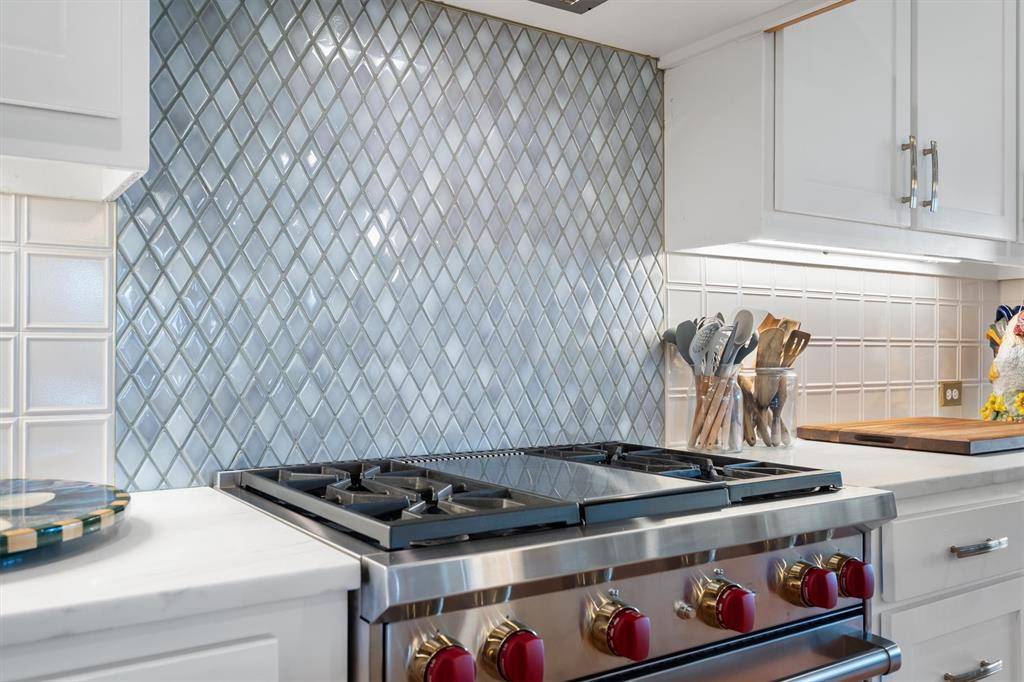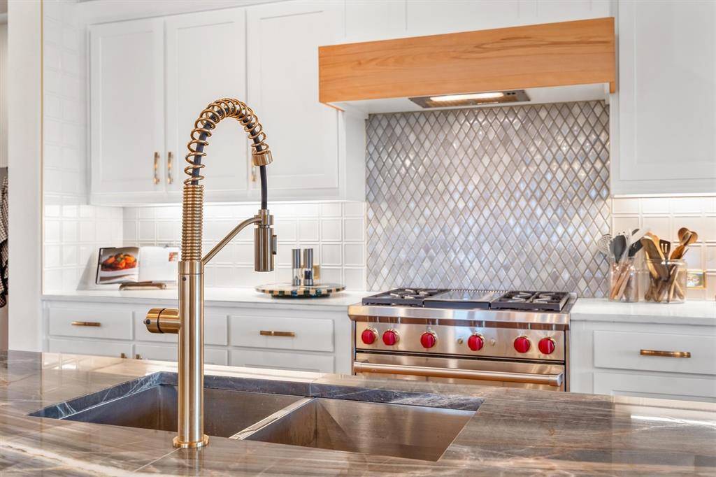 The chef's kitchen is a true showpiece, featuring recently upgraded quartzite countertops, a statement island, custom cabinetry, premium Wolf oven, designer vent hood, upgraded sinks, hardware, and lighting, all seamlessly opening to a spacious living area anchored by a freshly updated gas fireplace with custom mantel. Sliding doors, wood divider accents, and a fully integrated interior and exterior sound system enhance the home's modern appeal.