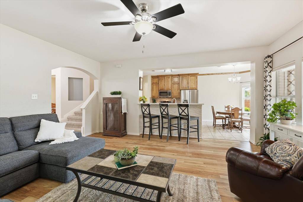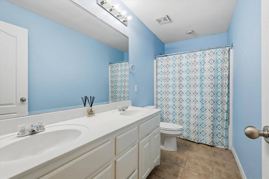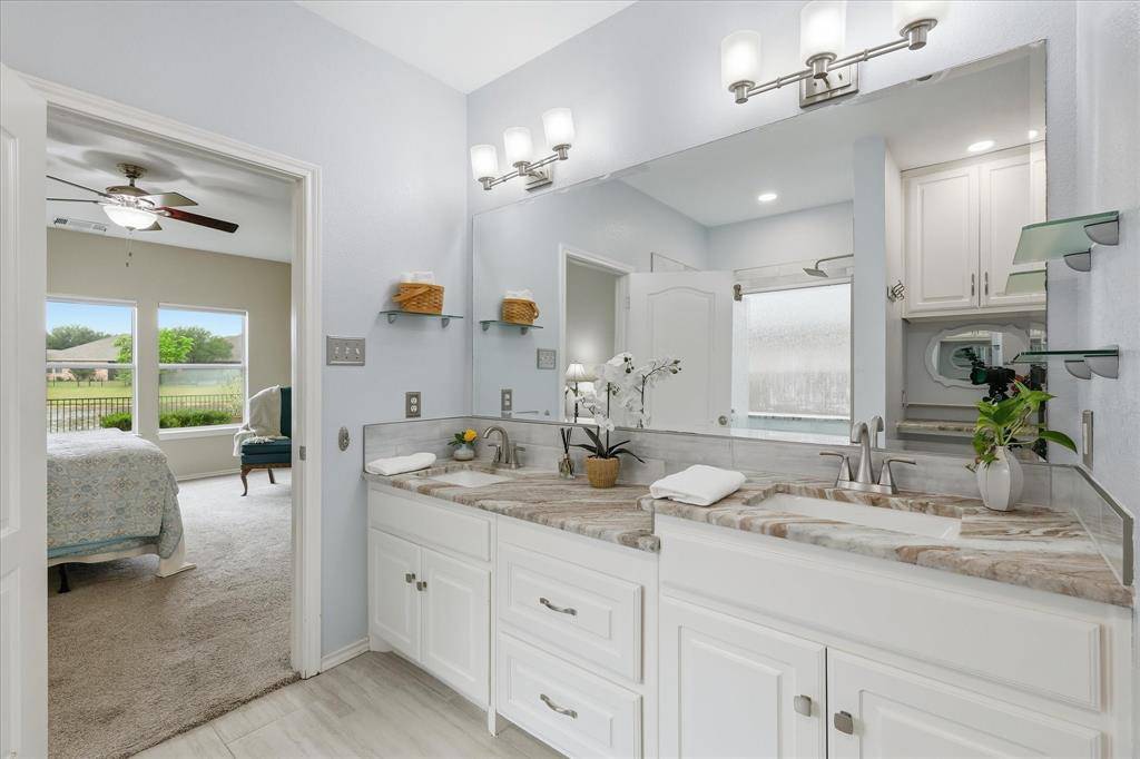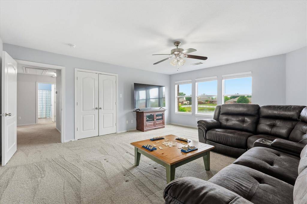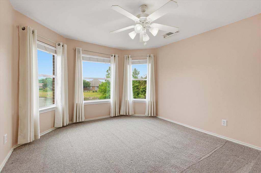 Welcome to this beautifully updated home in the sought-after Country Lakes community, perfectly positioned on a picturesque lot with tranquil pond views. From the moment you arrive, you'll appreciate the thoughtful updates, flexible layout, and inviting indoor-outdoor living spaces designed for everyday comfort and entertaining. The heart of the home is the fully renovated kitchen, featuring custom cabinetry, a stylish new backsplash, and updated countertops. Thoughtful design details include pull-out shelves in the cabinets for easy organization, plus additional custom cabinetry for overflow storage in addition to the corner pantry—making this kitchen as functional as it is beautiful. The main floor offers exceptional flexibility with a versatile flex room that can serve as a formal living room, home office, music room, or additional sitting area. The open living spaces flow seamlessly to the backyard, where an extended covered patio creates the perfect setting for relaxing or entertaining while enjoying peaceful views of the pond. The private primary suite is a true retreat with a beautifully updated bathroom featuring an oversized walk-in shower and modern finishes. Secondary bedrooms are generously sized, offering comfort and space for family or guests. Upstairs, you'll find a large game room, ideal for movie nights, play space, or a secondary living area. Additional features include newer carpet with upgraded pad for added comfort and a climate-controlled storage room, perfect for keeping holiday décor, keepsakes, and seasonal items protected year-round. With its thoughtful updates, flexible spaces, and serene backyard views, this home offers the perfect blend of style, function, and location.