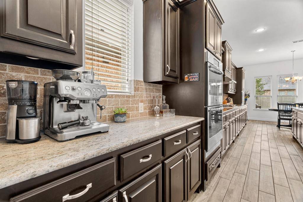At the heart of the home, the chef's kitchen is designed for both everyday living and entertaining, featuring an oversized island, gas cooktop, double ovens, coffee bar, abundant cabinetry, and an impressive 6x10 walk-in pantry with space for larger appliances.